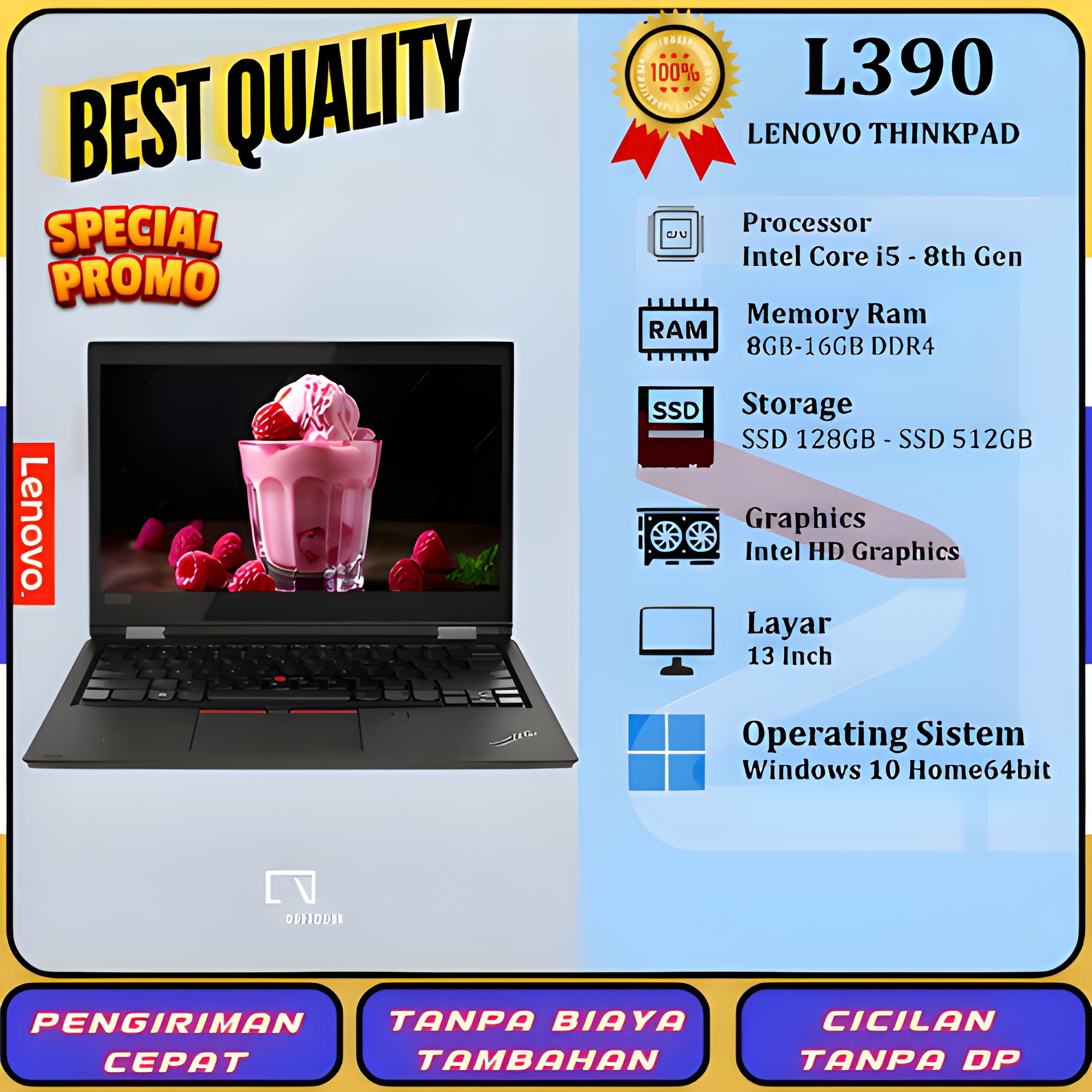 Laptop Lenovo Thinkpad Series i5/i7 | T470 T480 T490 L480 T14 E480 L13| 16GB 512GB | Second Bergaransi