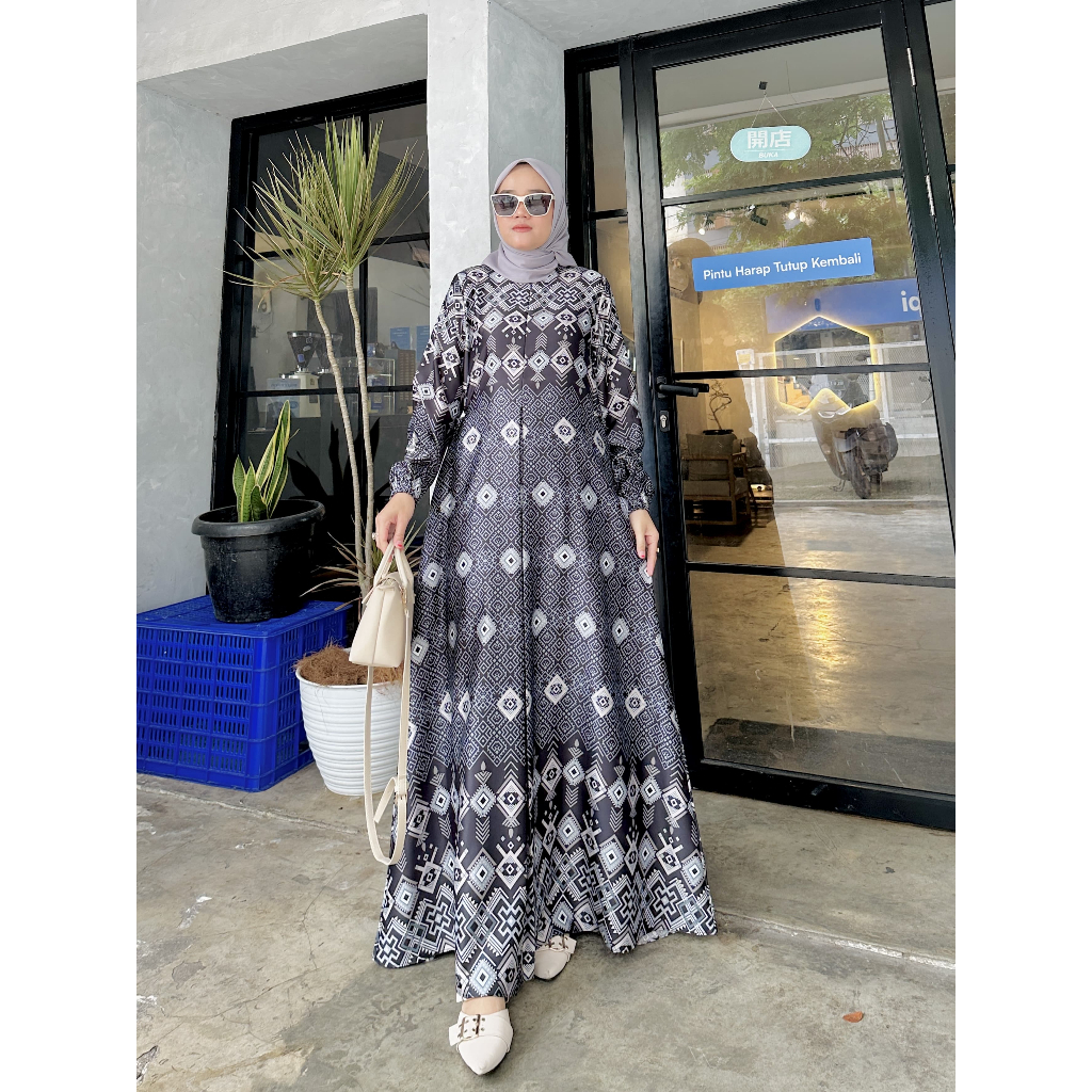 ()Gamis Aura | Gamis Pesta Silky Printing Premium Bunsui Jumbo Terbaru | Dress Mewah Makmara Silk