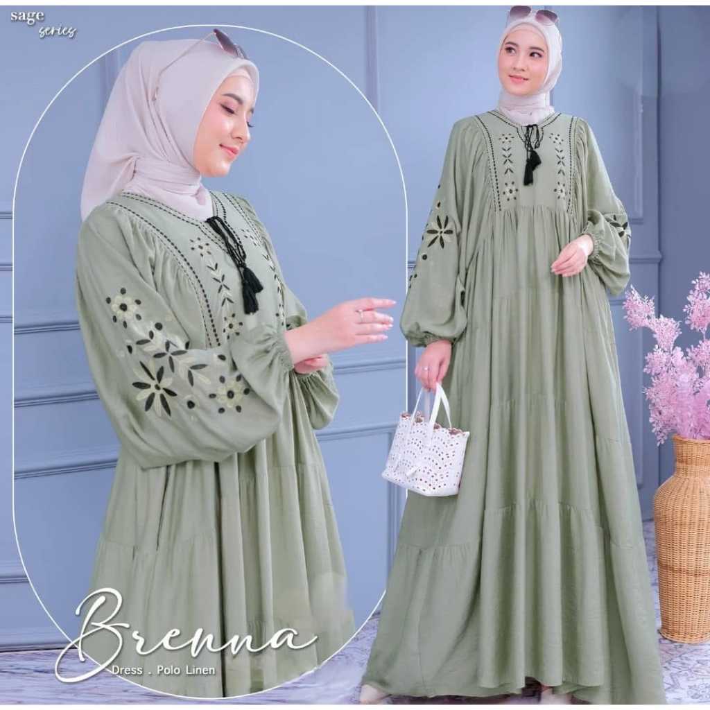 Brenna Dress Gamis Bordir Casual Size M L XL XXL - 3XL Pakaian Muslim Wanita Bahan POLO LINEN