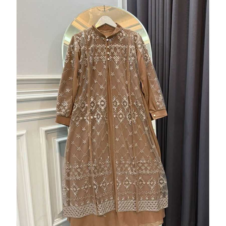 Gamis Kondangan Brukat Tile Warna Mahogany Denara Dress Ceruty Armani Full Puring Mix Payet Sworoski