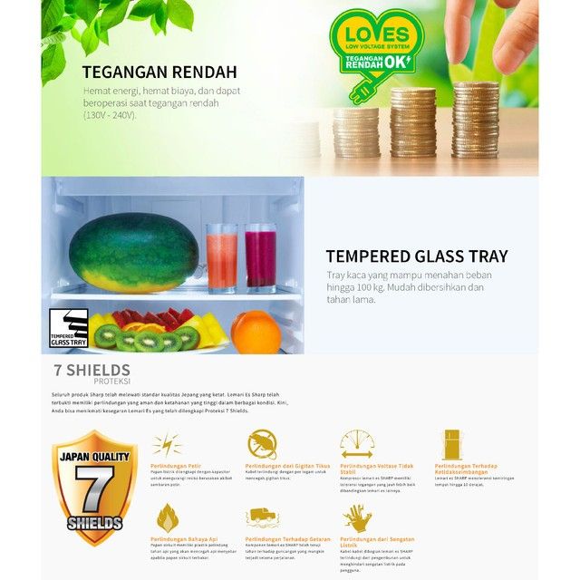 SHARP KULKAS 2 PINTU - KAPASITAS 172L - RAK TERPISAH - 3D SURROUND COOLING - LOW NOISE 39dB