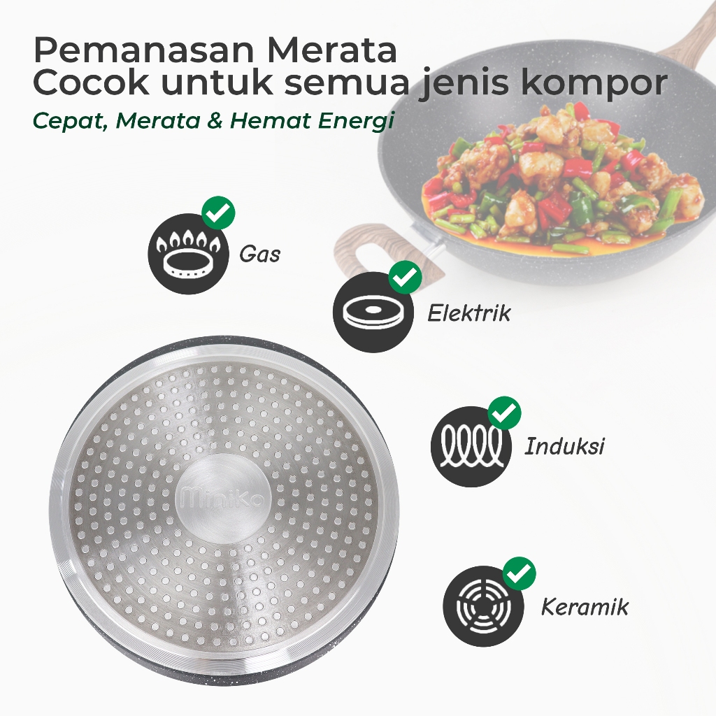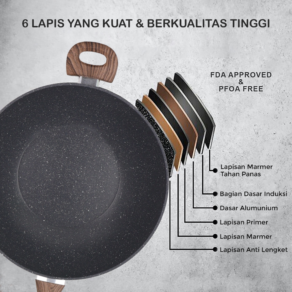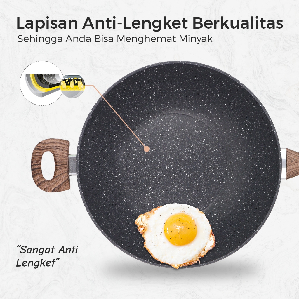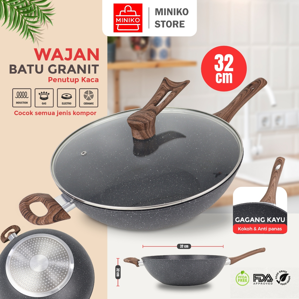 Wajan Penggorengan 32cm Lapisan Granit Anti Lengket Tutup Kaca Dan Gagang Kayu