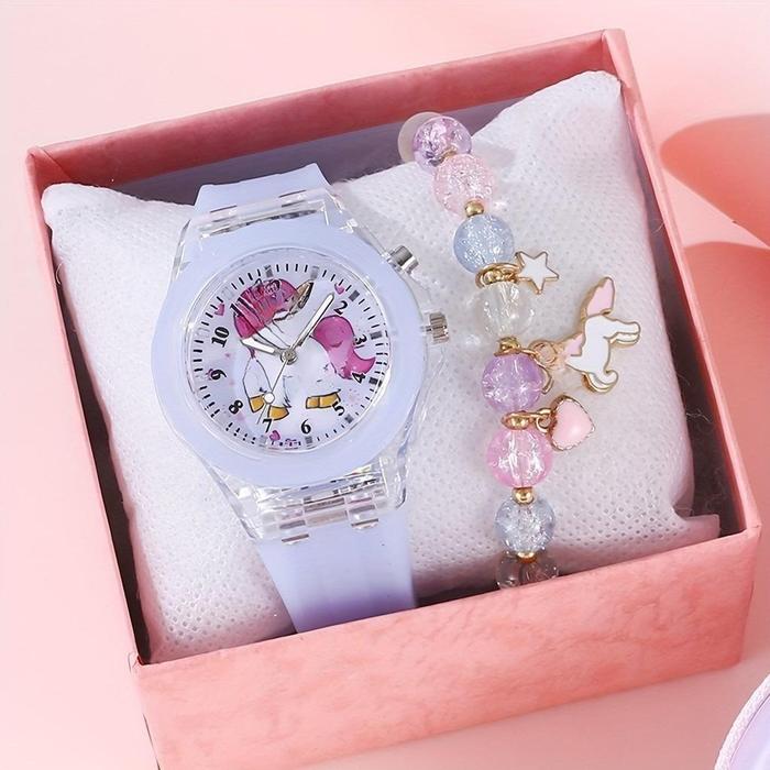2PCS Gelang Gratis Jam Tangan Kuarsa Anak Kartun Silikon Jam Tangan Fashion Silikon Bercahaya - Pink