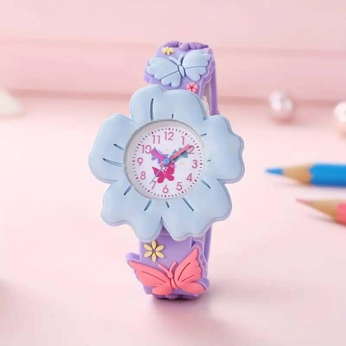Jam Tangan Kuarsa Anak-Anak Bunga Kartun Kubik Kupu-Kupu Tali Silikon Jam Tangan Cantik Fashion - purple