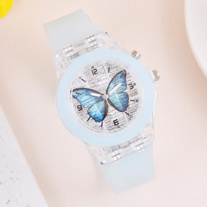 2PCS Jam Tangan Kuarsa Anak Kartun Kartun Kupu-KupuLED Menyala Dengan Gelang Fashion Manik-Manik - Blue