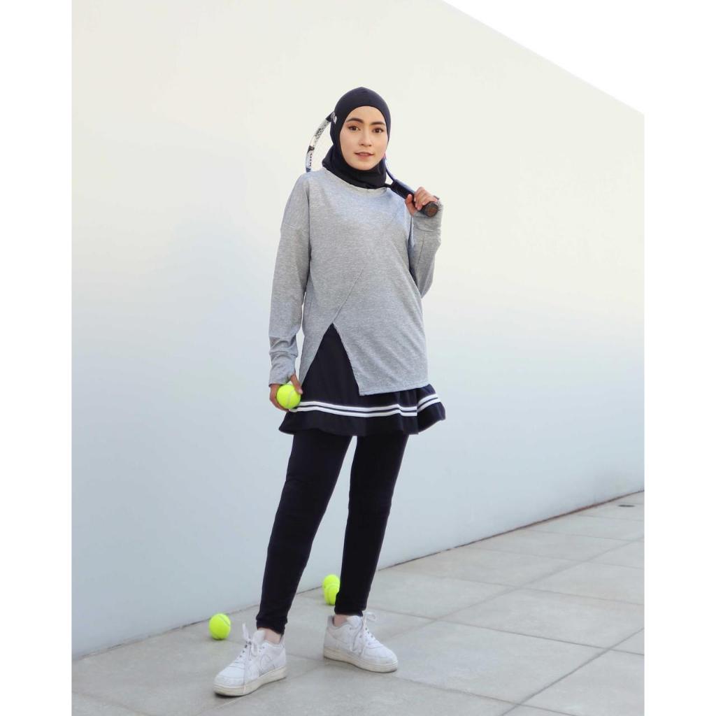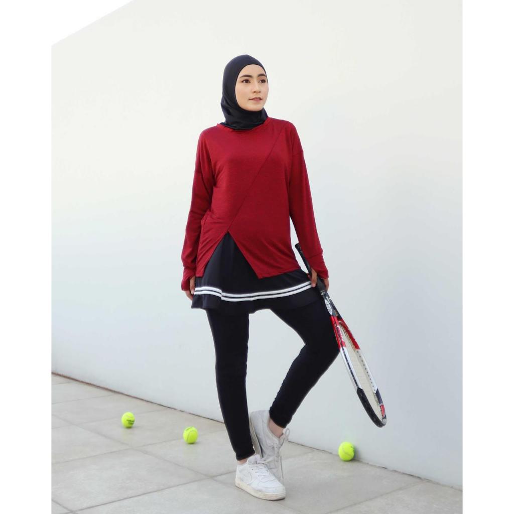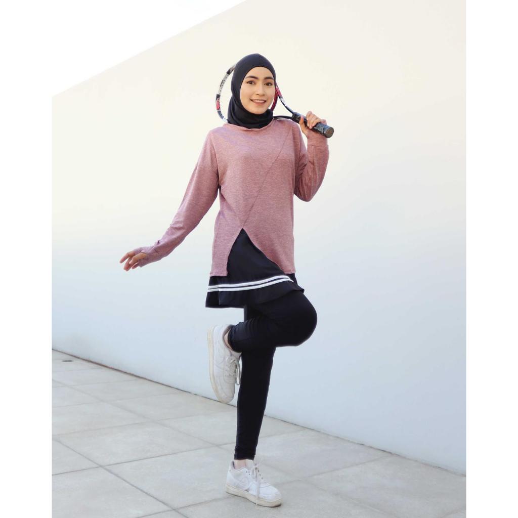 Baju Olahraga Wanita Muslimah Lengan Panjang Long Sleeve Slit Top Tennis Gym Yoga Padel Pilates Maraton - 0052