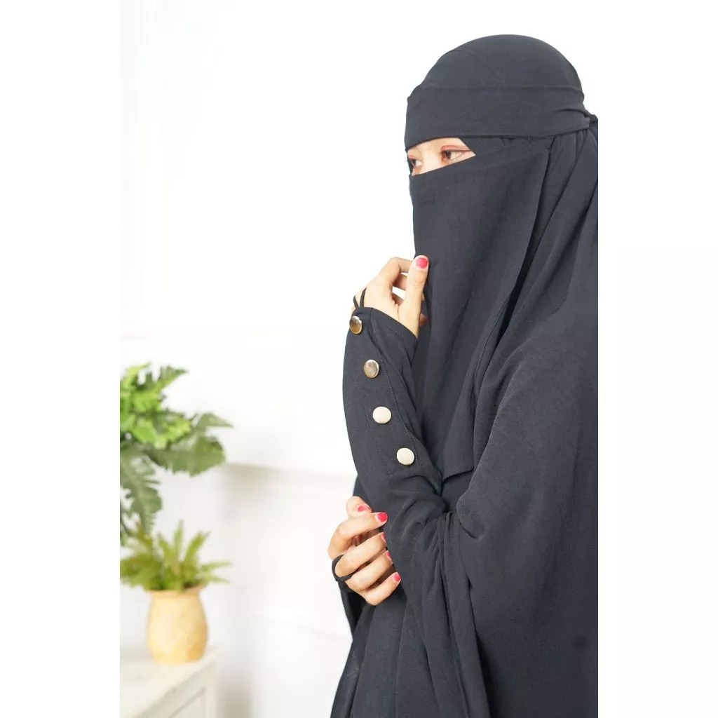 Gamis Set Abaya Cadar Syari Umroh Khimar Jumbo French Haji Bankuningan mengkilap Kancing Premium