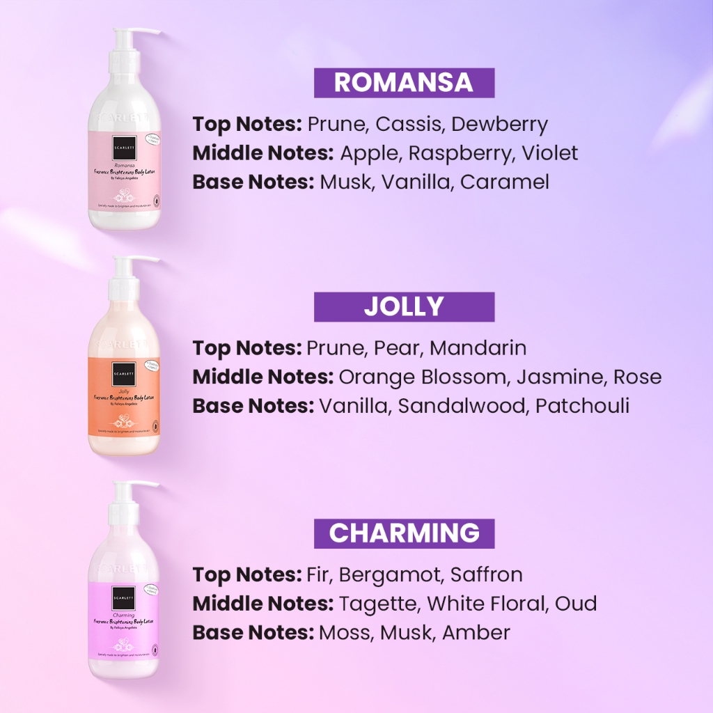 Scarlett Whitening Body Lotion ( Happy, Jolly, Charming, Romansa, Fantasia, Freshy ) Melembabkan dan Mencerahkan Tubuh