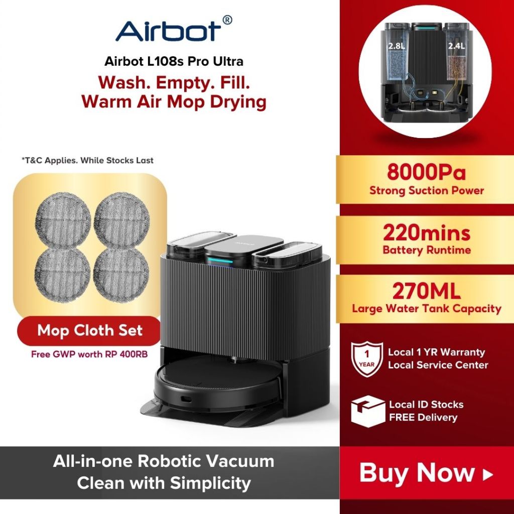 Airbot Robotic Vacuum L108S Pro Ultra, 8000Pa, Auto Washing Mop, Auto Empty Dust Bin, Hot Air Mop Drying, Rotating Mop LiDar