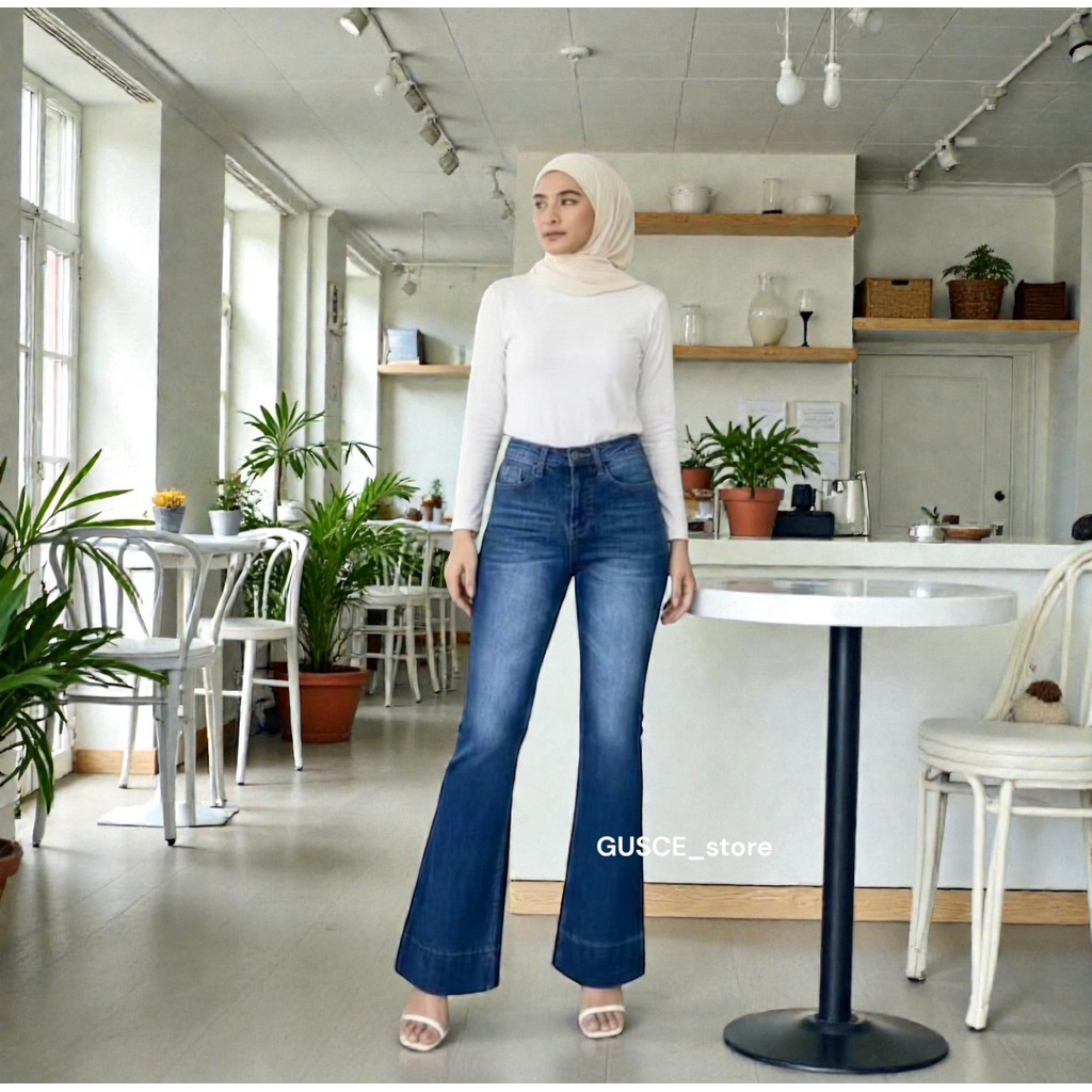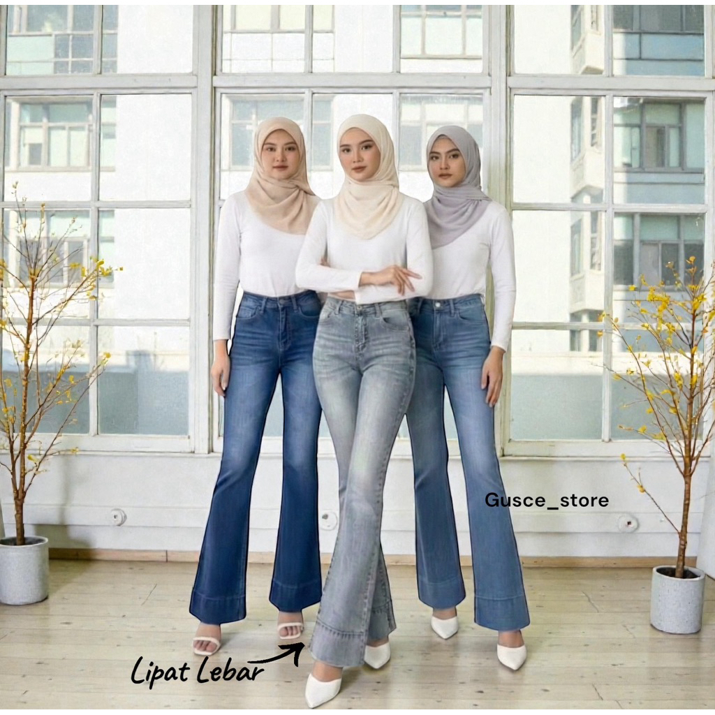 Jennie-HighWaist Cutbray Jeans Celana Flare Panjang Stretch Wanita Retro Vintage Lipat Bawah