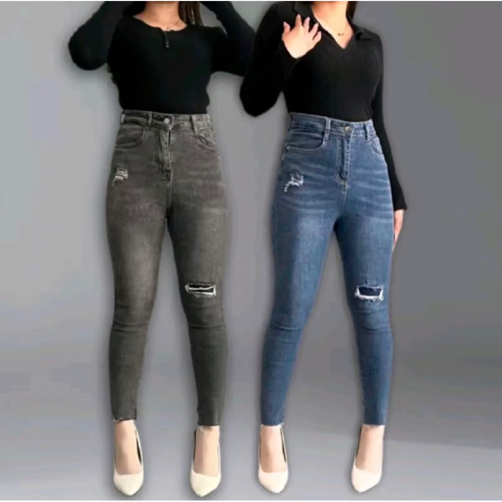 celana panjang highwaist jeans strecth wanita pinggang silang kancing dua polos ripped sobek tambal skinny jeans Tebal 2025