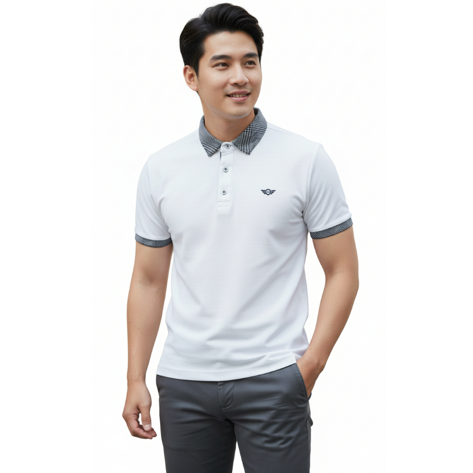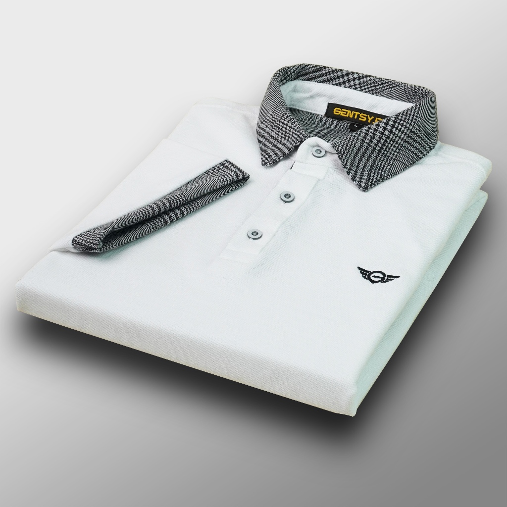 Gentsy Kaos Polo Shirt Pria Katun Pique Warna Putih Kerah Dan Lengan Motif Plaid Dewasa