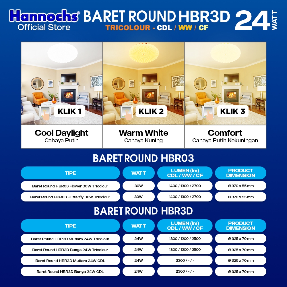 Hannochs Lampu Downlight LED Baret Round HBR3D Bunga 24W Tricolour