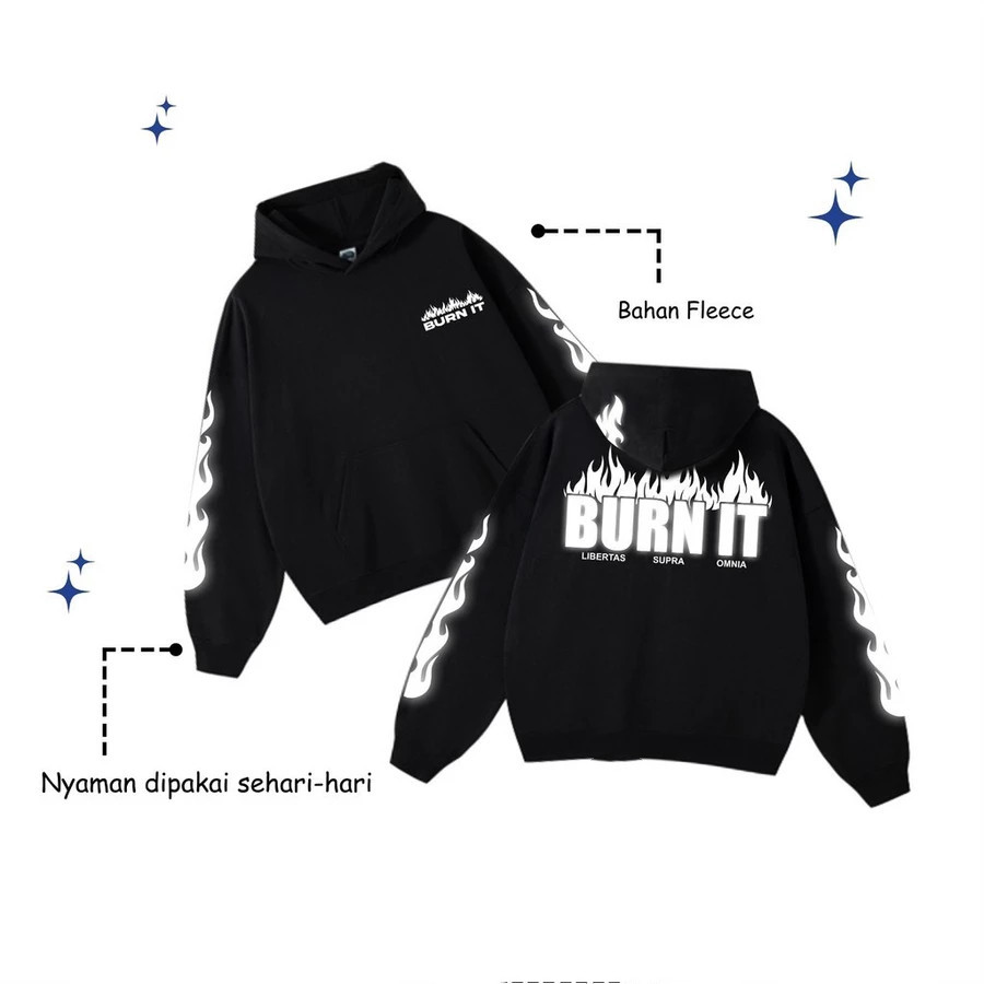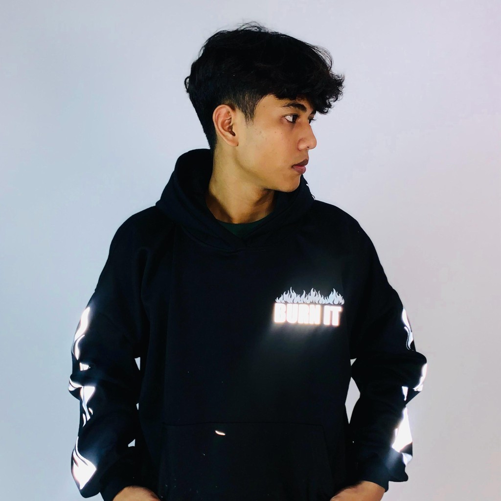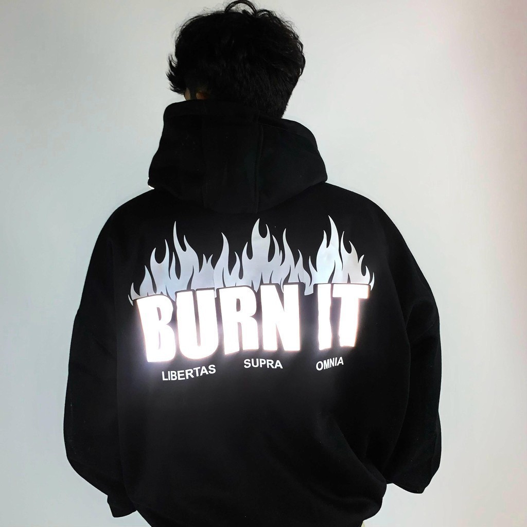 Original Trend Reflektif Silver Hoodie "Burn It" Korean Moto Street Style 24S Cotton Hoodie