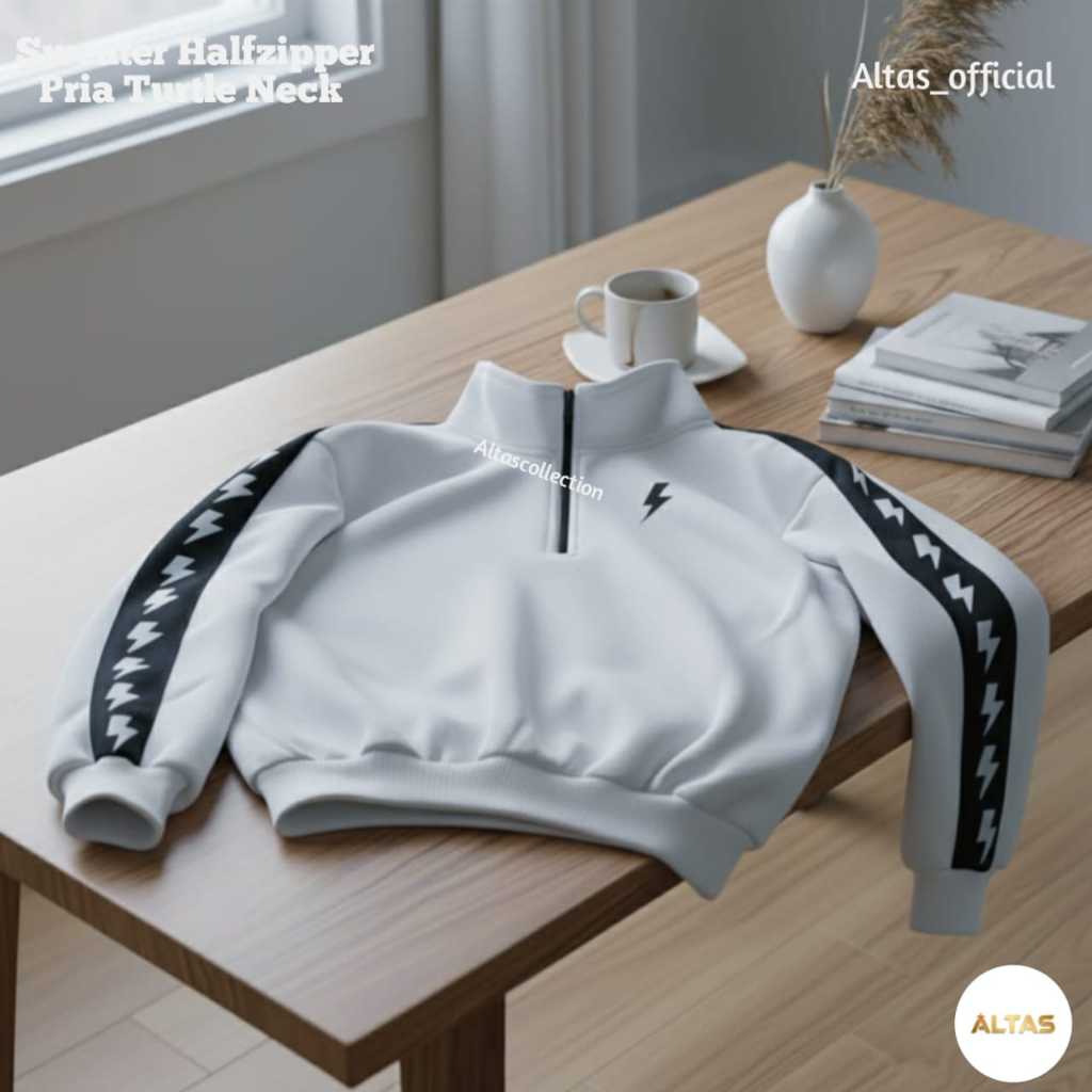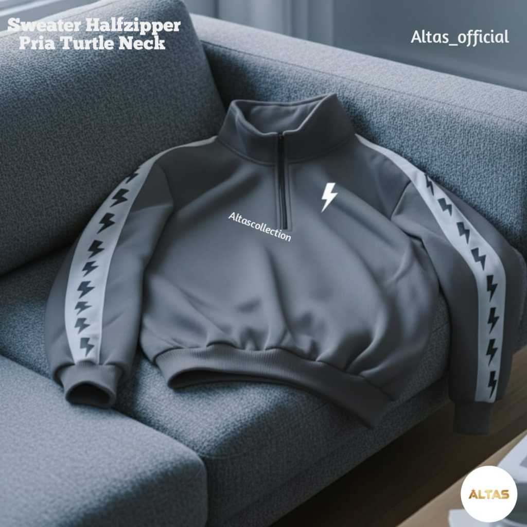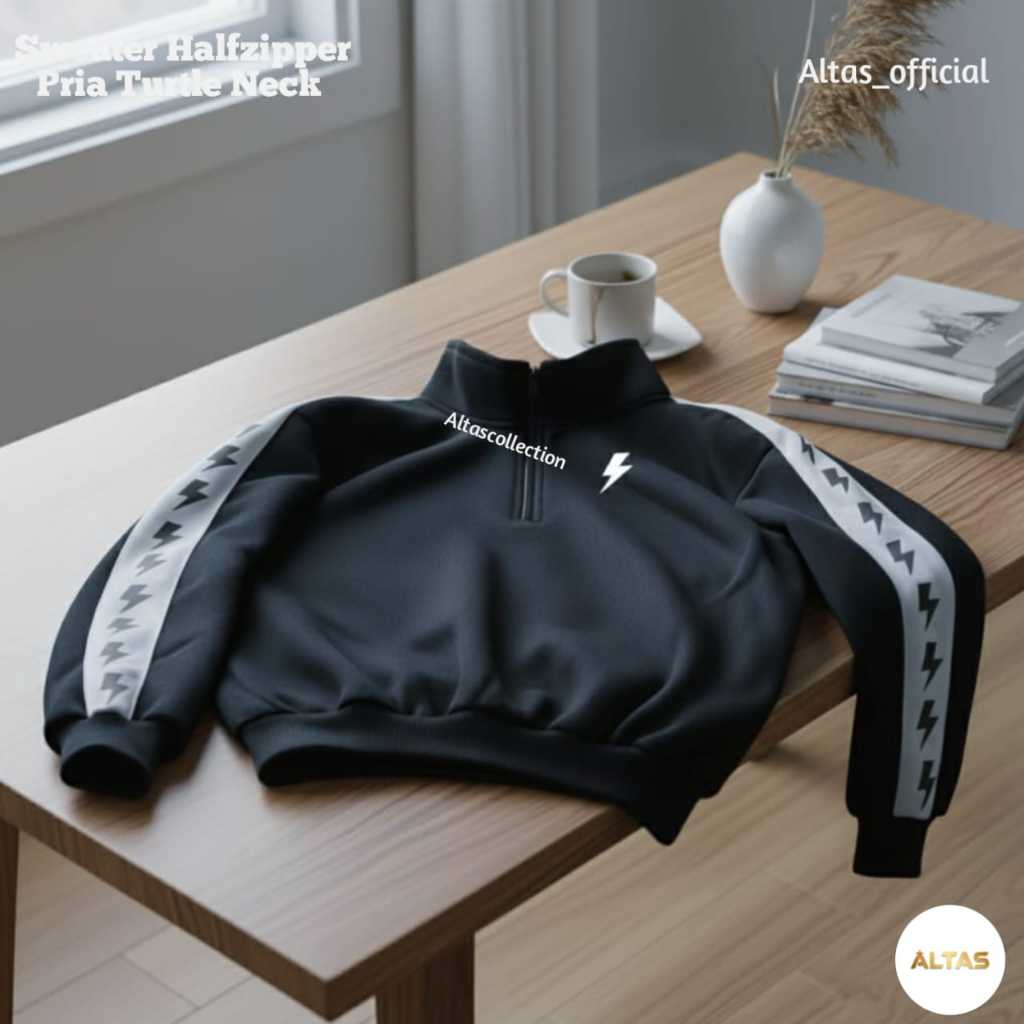 Altas Sweater Halfzipper Kombinasi 2 Warna Sablon Petir Turtle Neck Pria Wanita