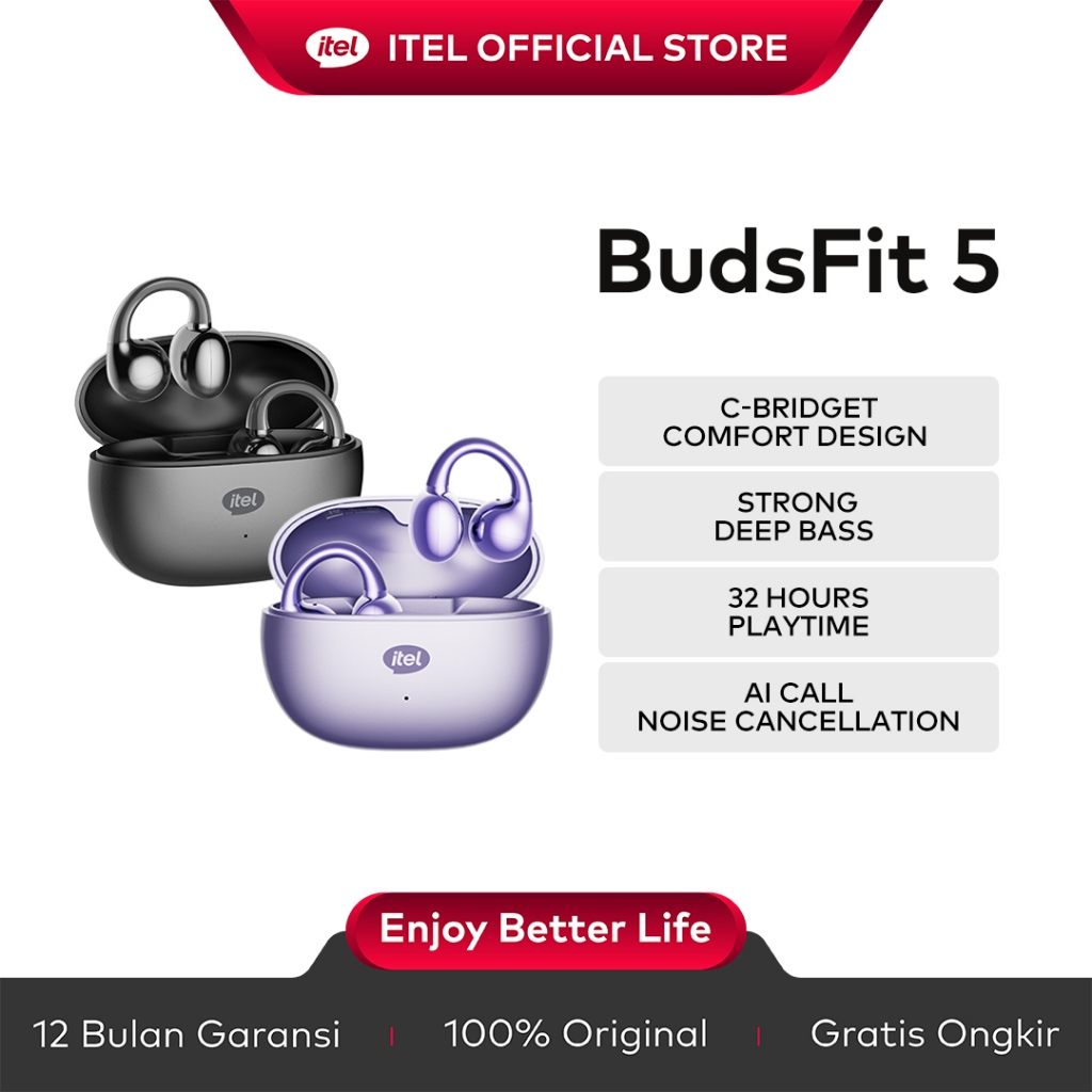 itel BudsFit 5 Open-Ear TWS Bluetooth 5.4 Design C-Brigde Deep Bass 12mm, 32 Jam Playtime, IP54 Sport Earbuds AI Noise Cancelling, Pengisian Daya Cepat