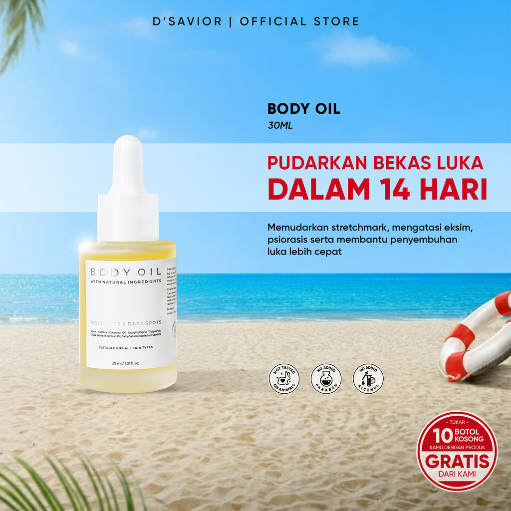 D’Savior Body Oil 30Ml | Penghilang Bekas Luka, Eksim, Psioriasis, Stretchmark Dan Gatal Alergi