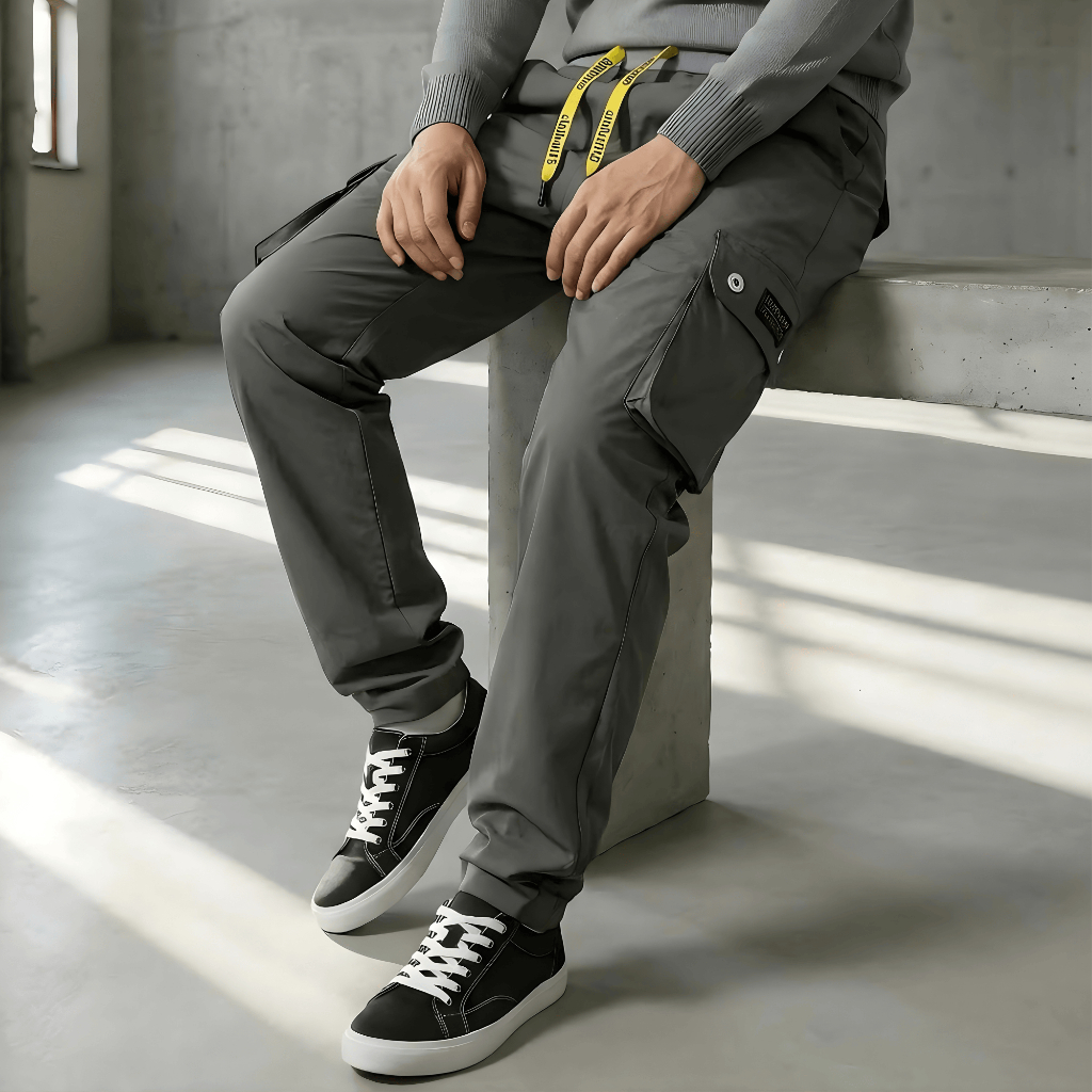 Celana Cargo Panjang Pria Pinggang Rib Karet Tali, Bahan Tebal Premium Stretch Melar