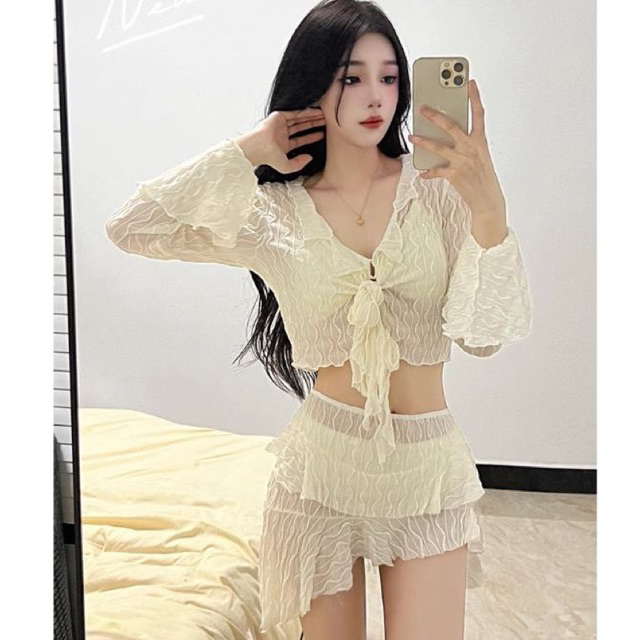 Katata Bikini 4Pc Premium Swimsuit Set Bikini Import Free Outer Lengan Panjang Dan Rok Mini Broken White Bk86