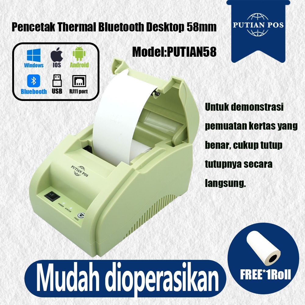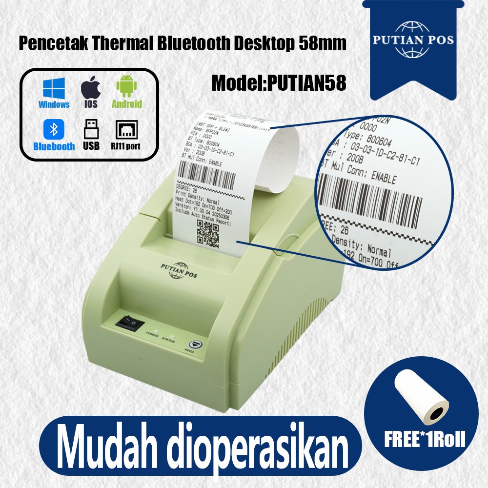 PUTIAN POS Desktop 58mm Bluetooth Thermal Printer PUTIAN58 Cashier Bill Printer Android, USB