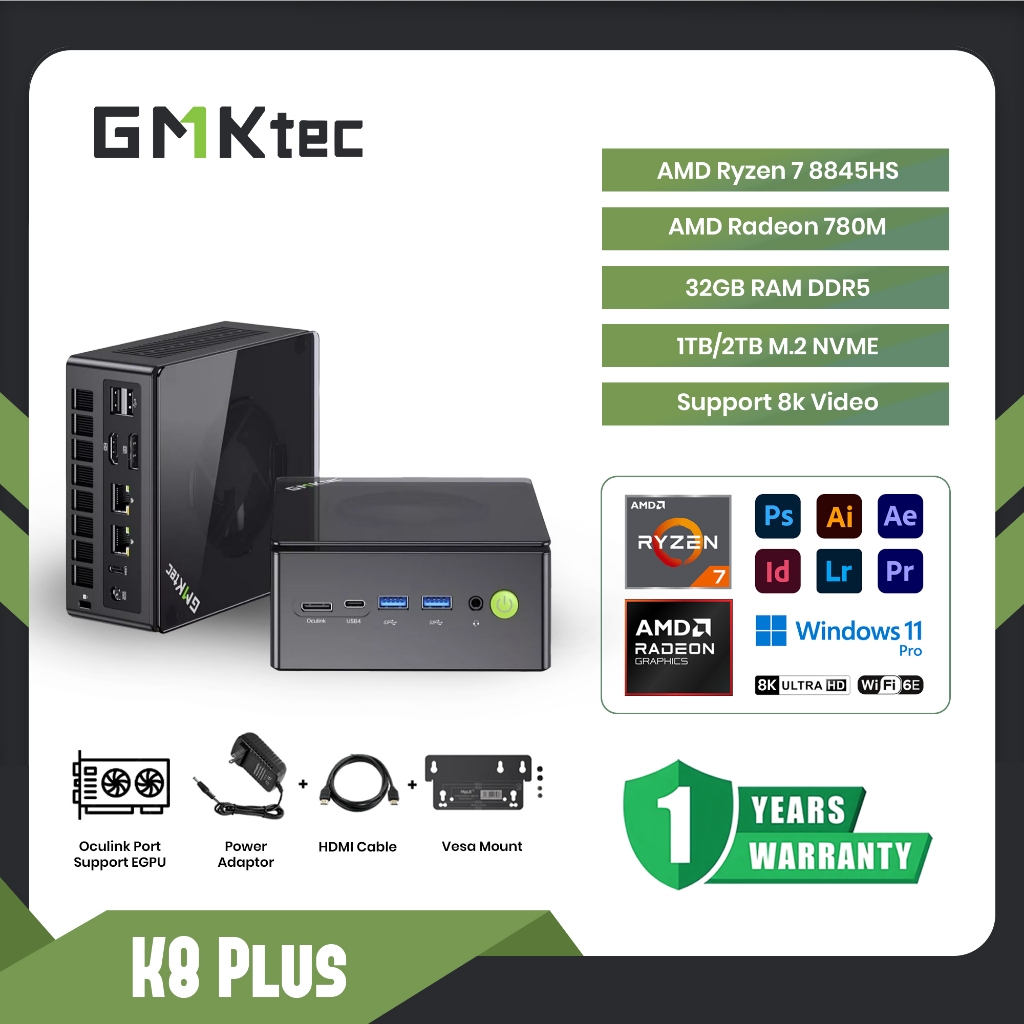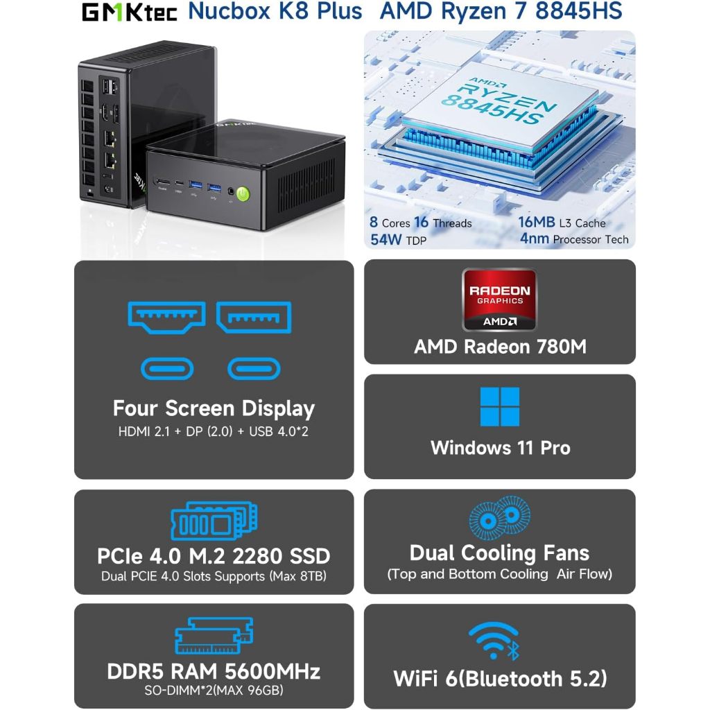 Mini PC Gaming AMD Ryzen 7 8845HS GMKTEC K8 Plus 32GB Ram Ddr5 1TB Ssd Nvme - Win 11 Pro 8K Video