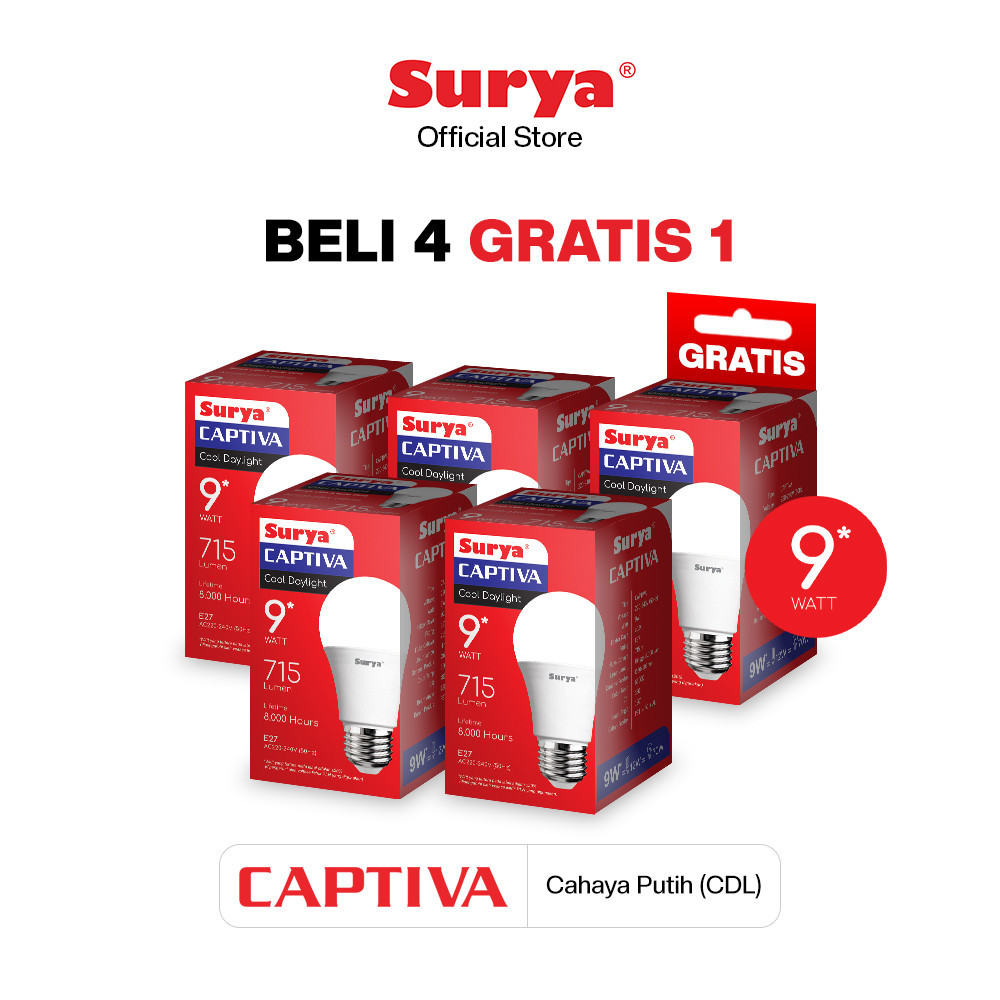 Surya Lampu Bohlam LED Captiva 9 Watt Cahaya Putih (Beli 4 Gratis 1)