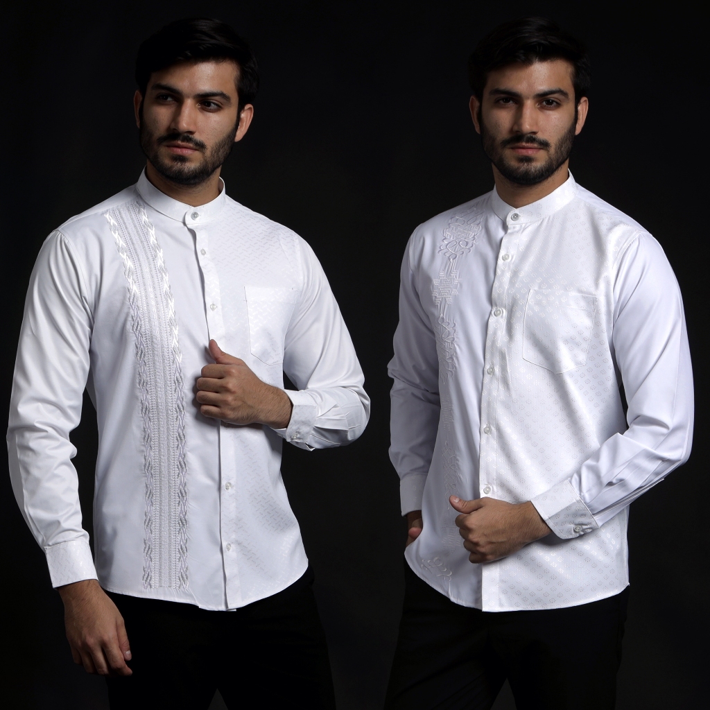 Casella Baju Koko Pria Lengan Panjang Arabesque Embroidery White Design | Baju Koko Putih Lengan Panjang