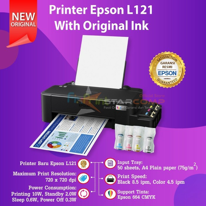 Epson L121 Printer EcoTank A4 Single Function Printer Print Only Include Tinta