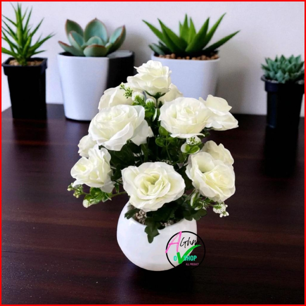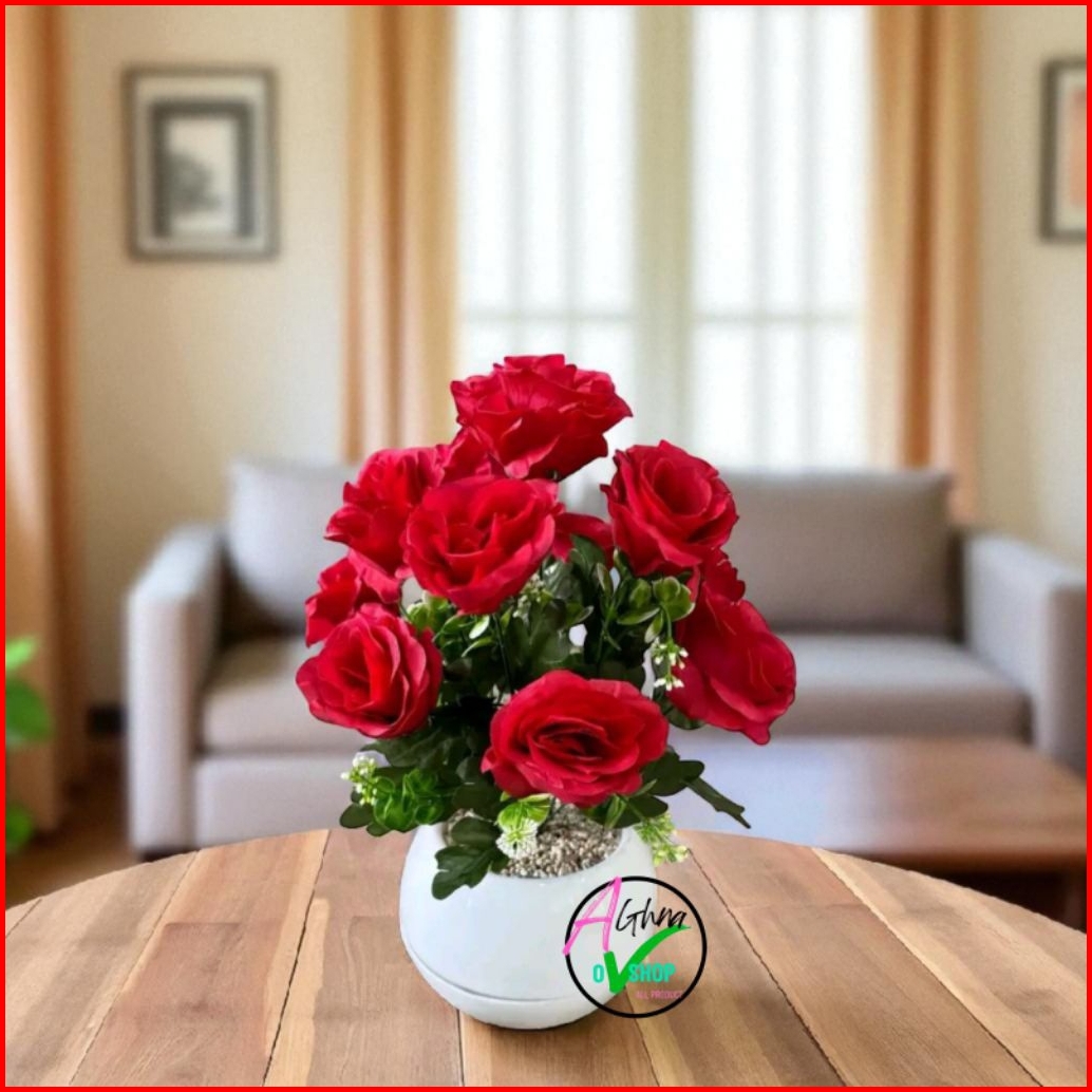 Bunga Hiasan Meja Mawar 12 Cabang Lengkap Dengan Vas Vienna Pot Pelastik
