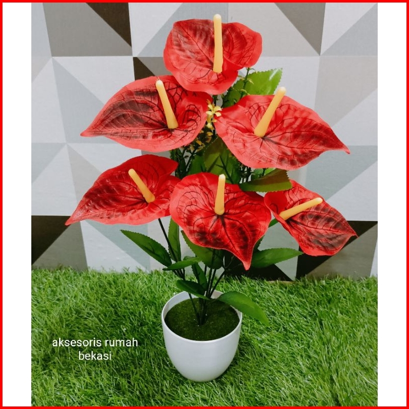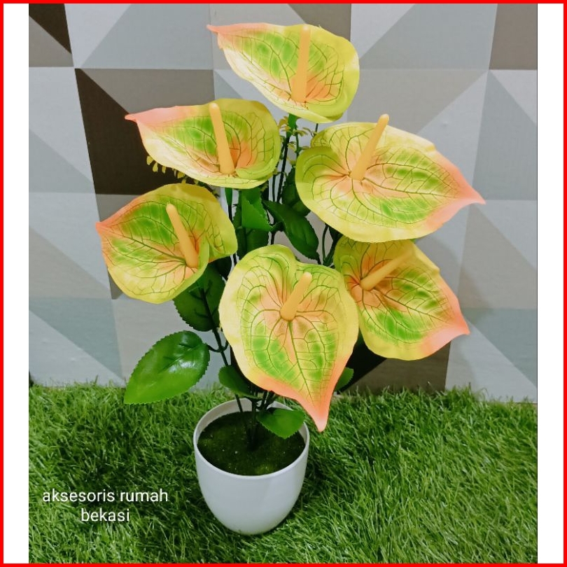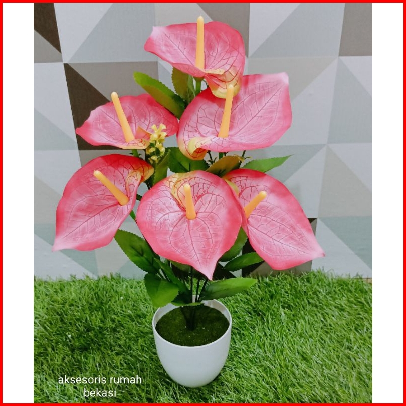 Bunga Aron Panda Artificial 6 Kuntum Dengan Pot Bulat Lumut