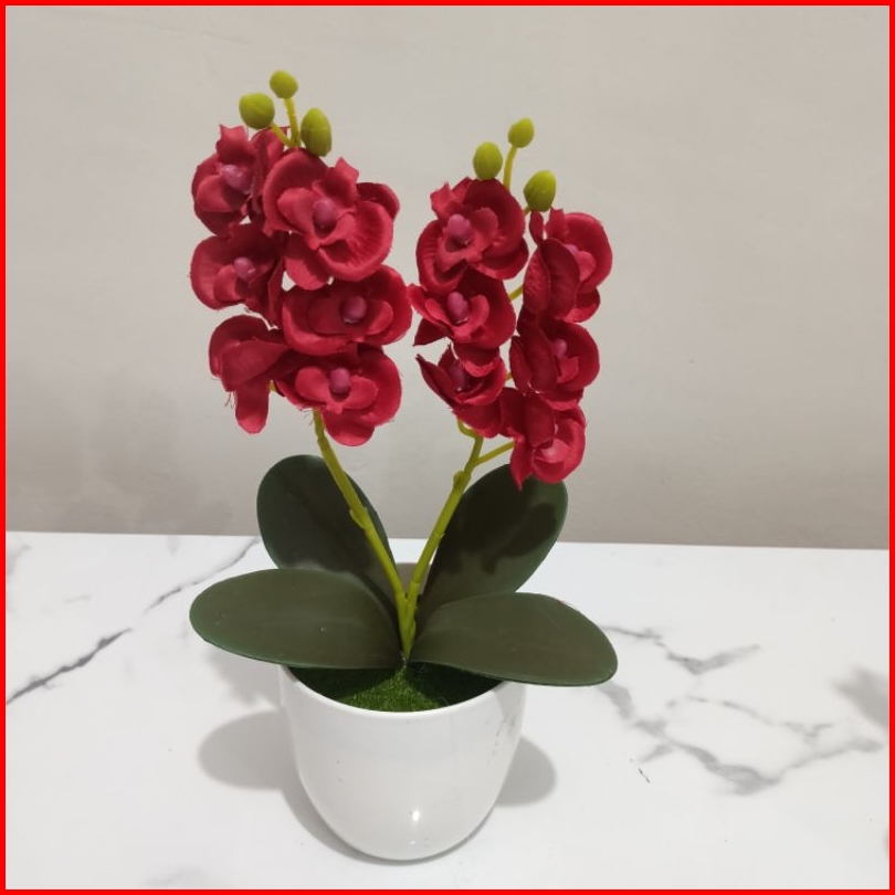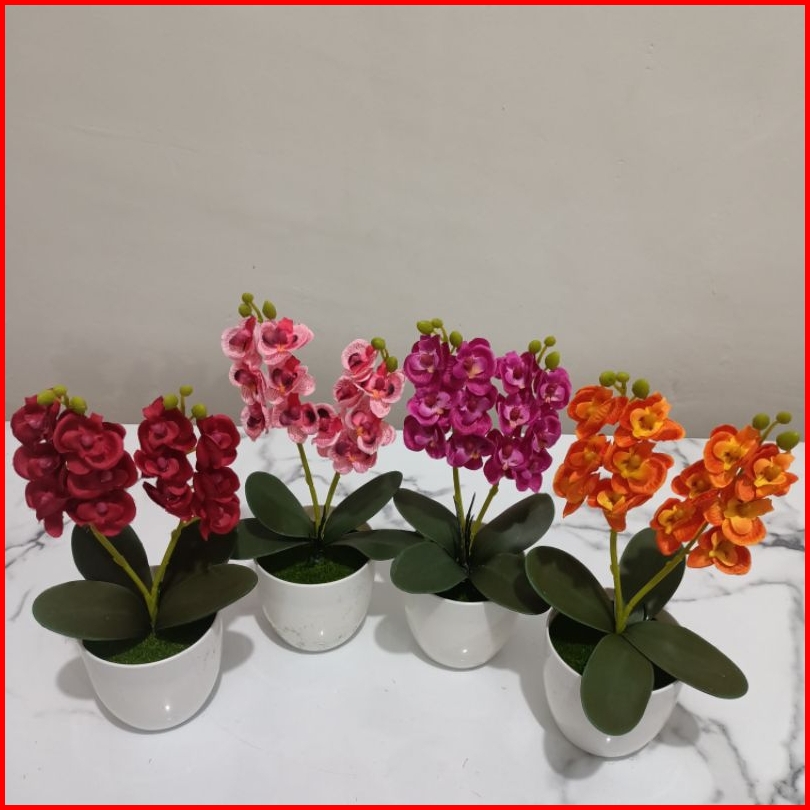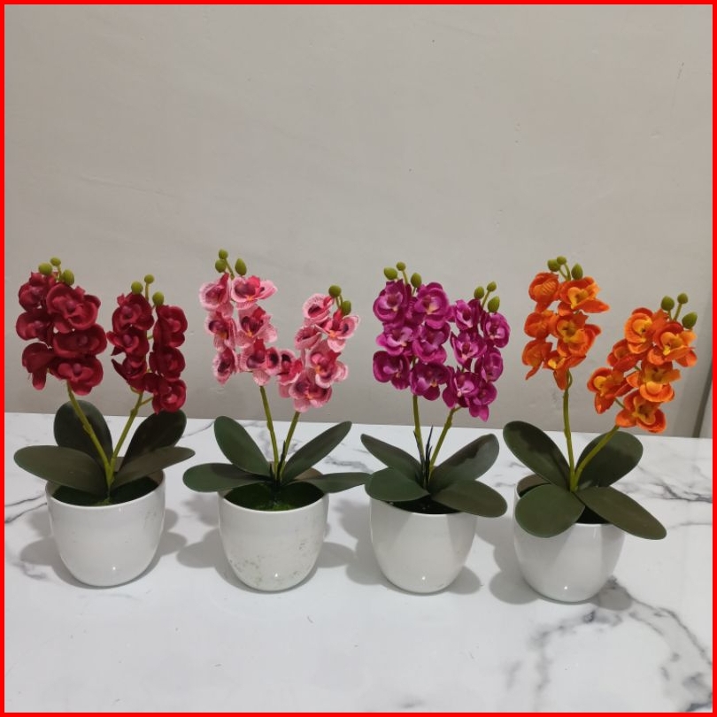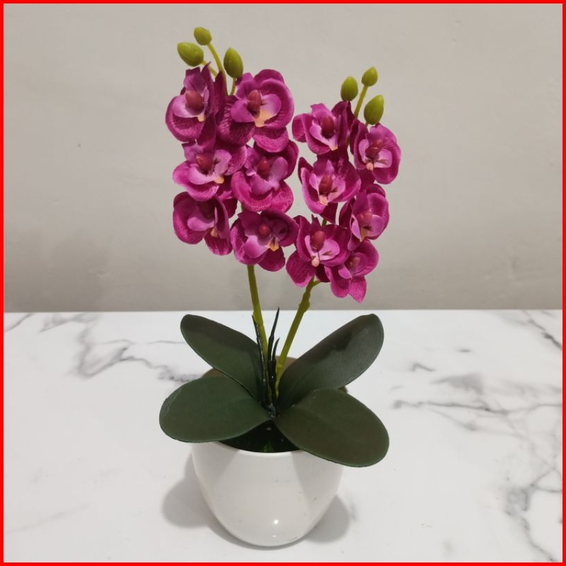 Bunga Meja Hias Anggrek Artificial 2 Cabang 4 Daun Set Dengan Pot Bulat