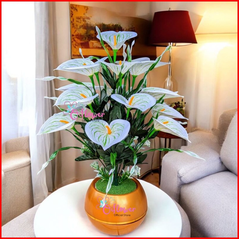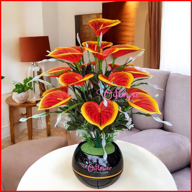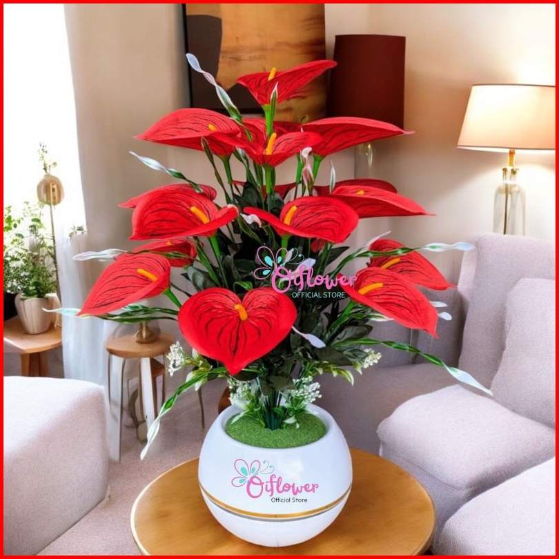 Bunga Hias Anthurium Lily Satu Set Dengan Vas Pot Super Bola Plastik Hiasan Dekorasi Meja Ruangan