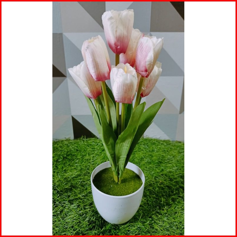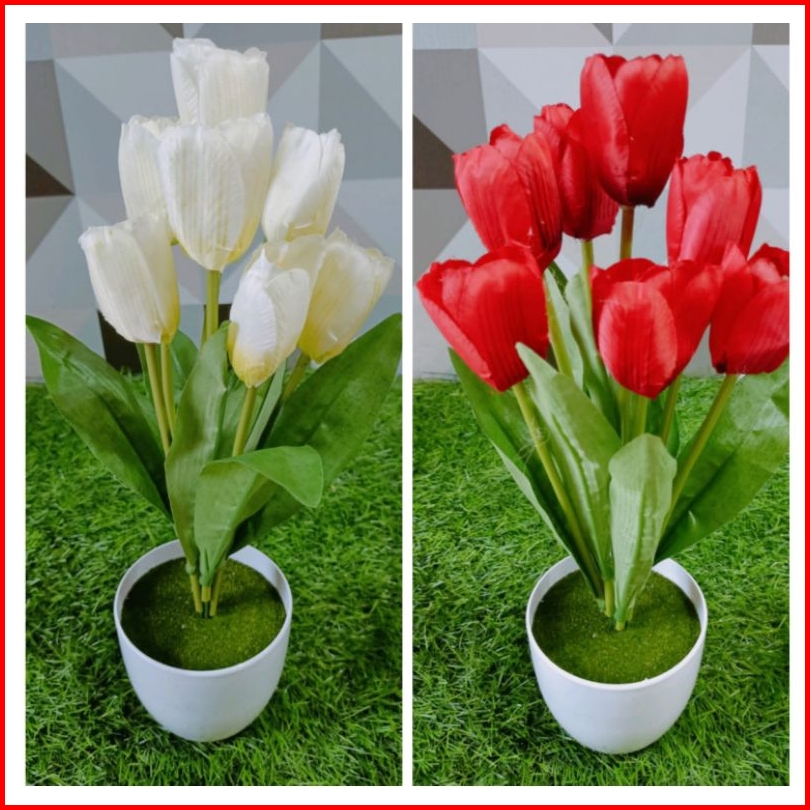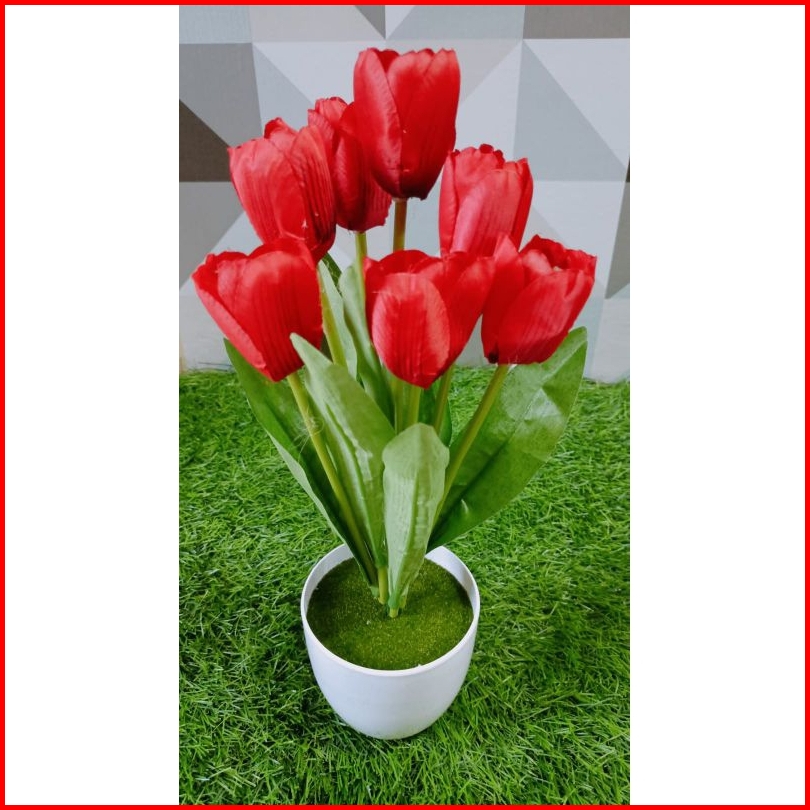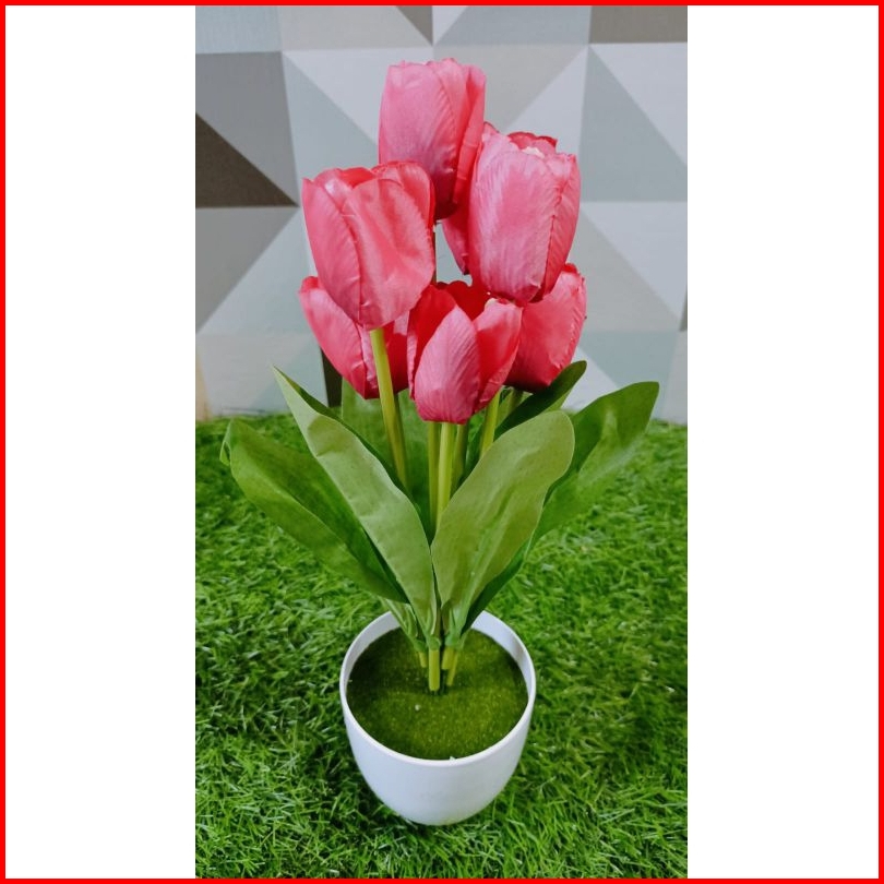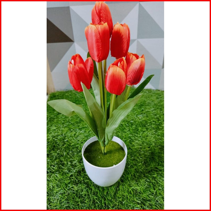 Bunga Tulip Artificial Dengan Pot Lumut Plastik Bulat
