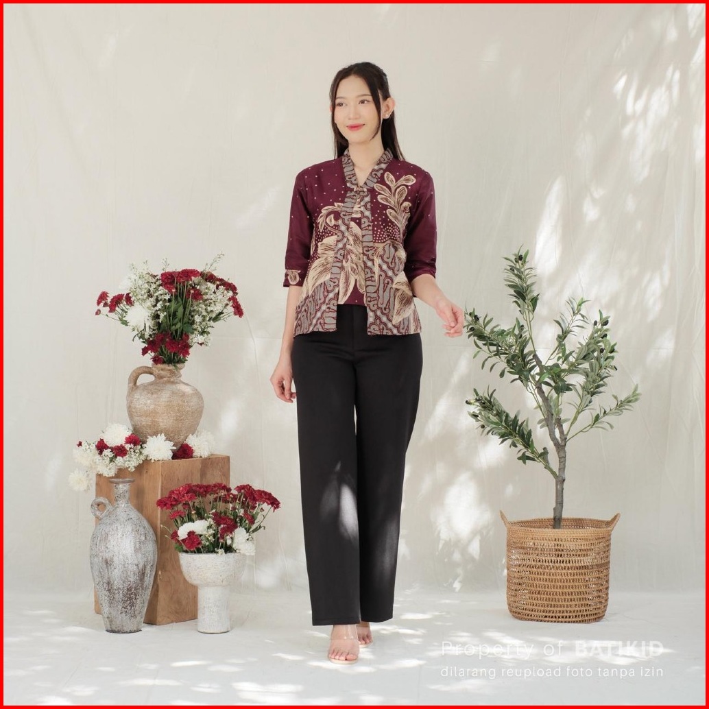 Batikid Atasan Batik Wanita Lengan 3 4 Batik Kerja Casual Bahan Katun Asli Orchid Burgundy