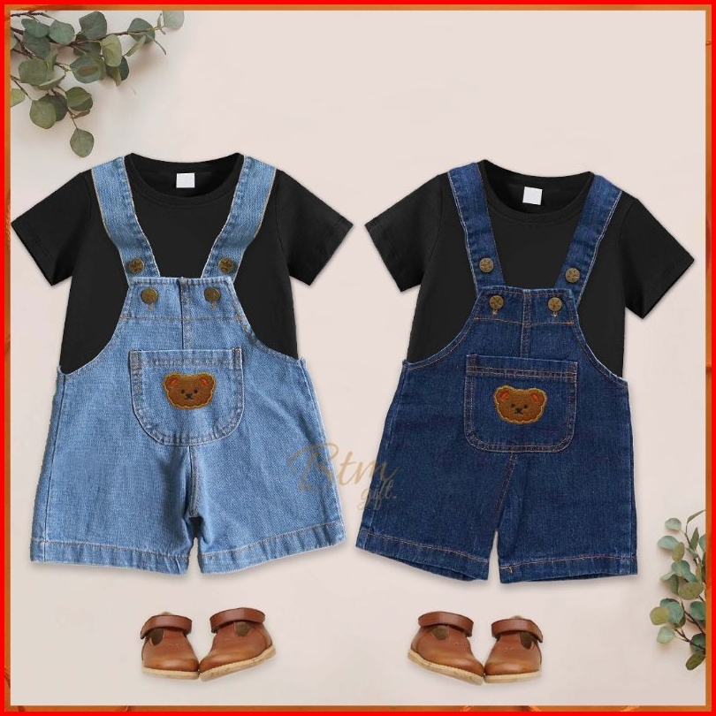 Overall Jeans Bayi Tebal Halus Baju Anak Perempuan Laki Laki 0 1 2 3 4 Tahun Bordir Karakter Bear Beruang Denim Biru Nav