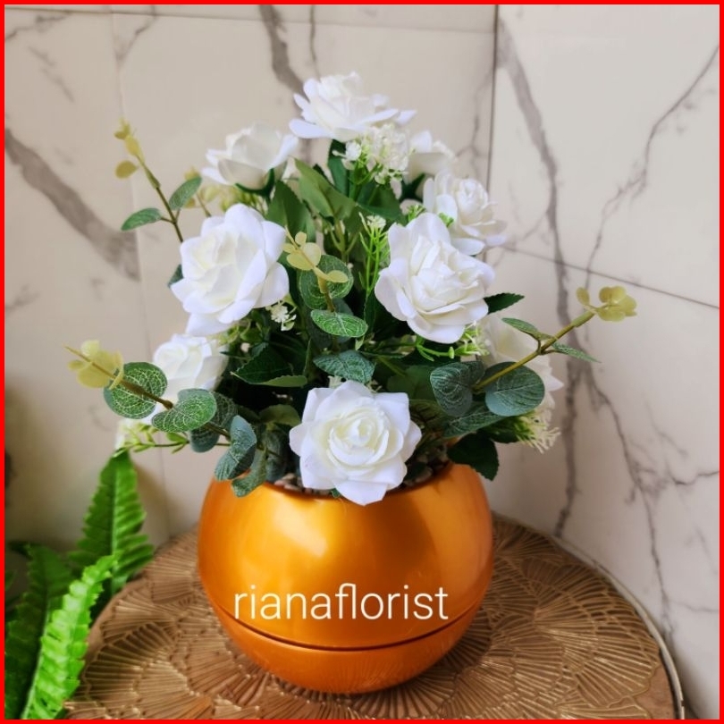 Bunga Mawar Bludru Kombinasi Daun Dolar Artificial Vas