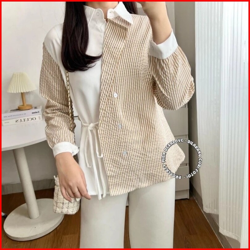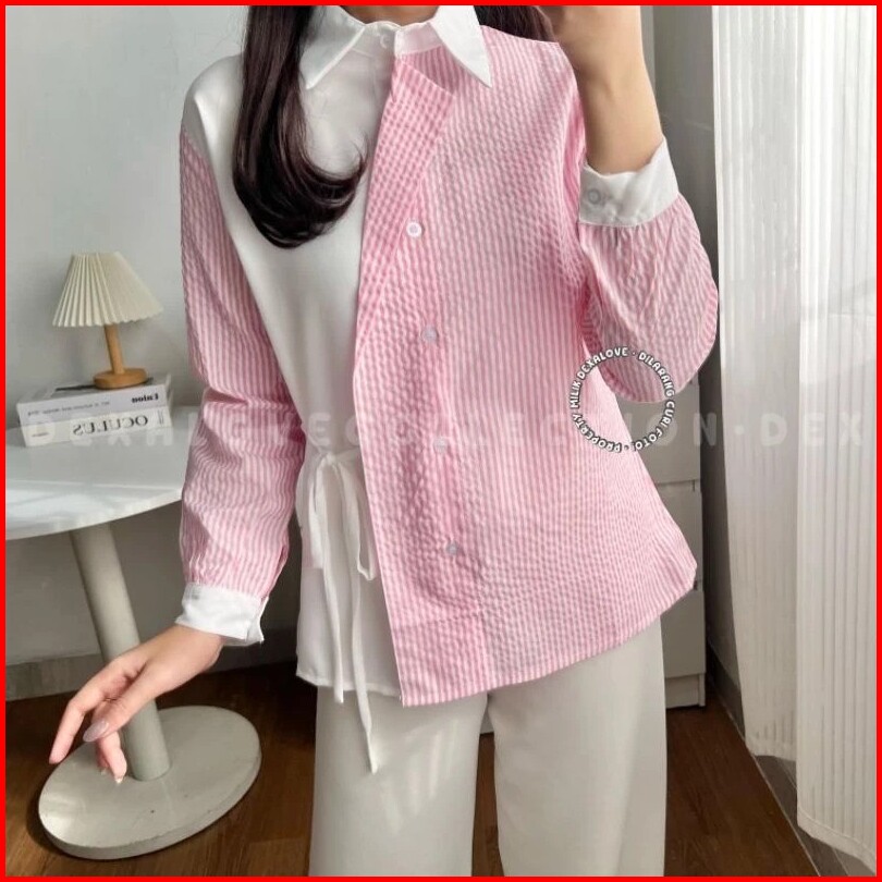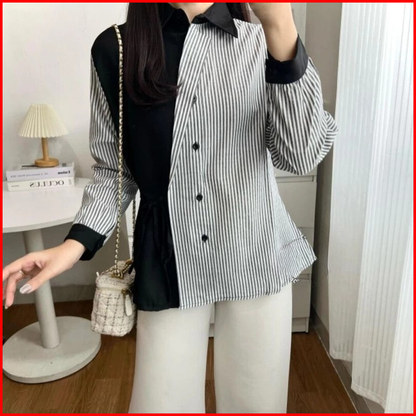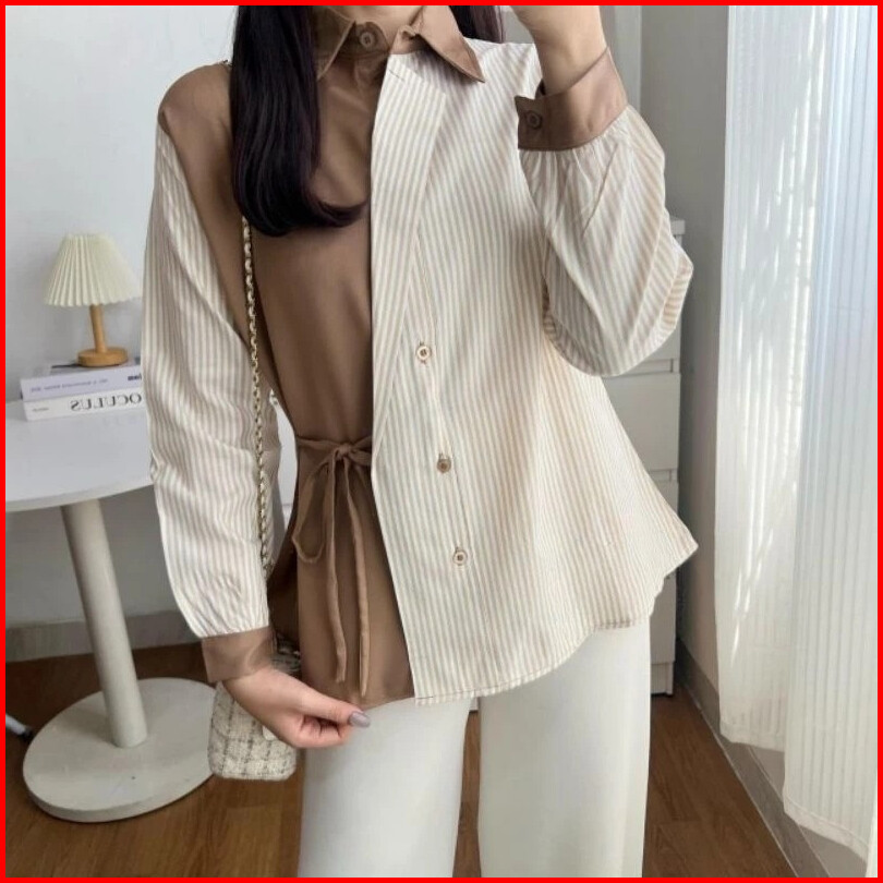 Kemeja Kanza 02 Kemeja Wanita Kombinasi Motif Salur Lengan Panjang Joana Fashion