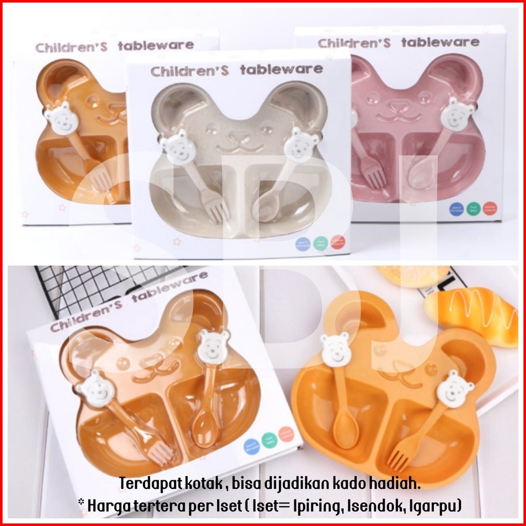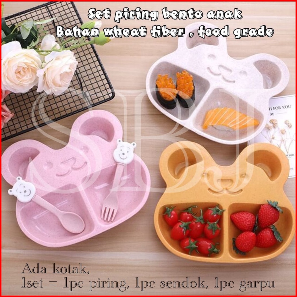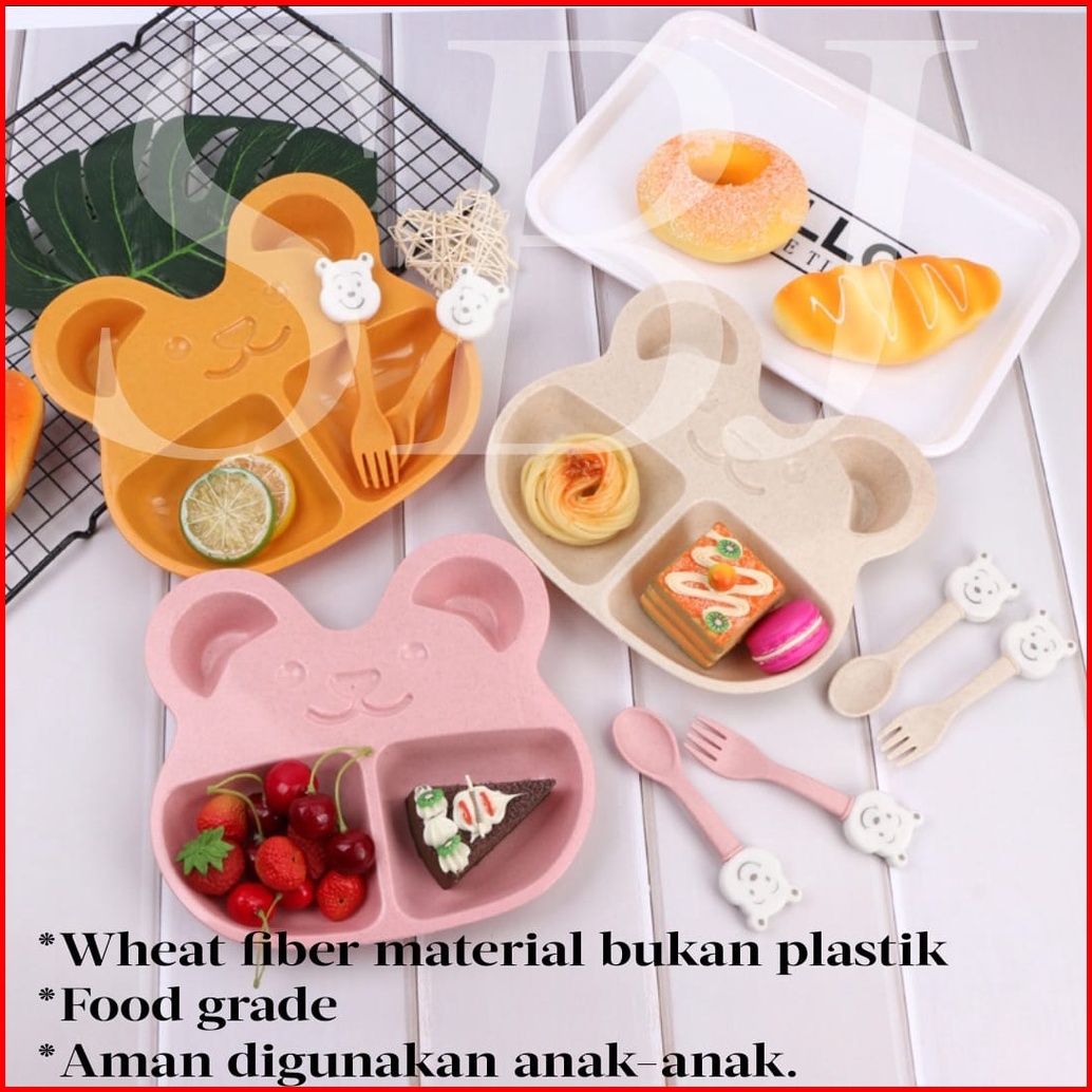 Piring Makan Anak 1 Set Sendok Garpu Dengan Sekat Bento Bahan Wheat Fiber Food Grade Bpa Free