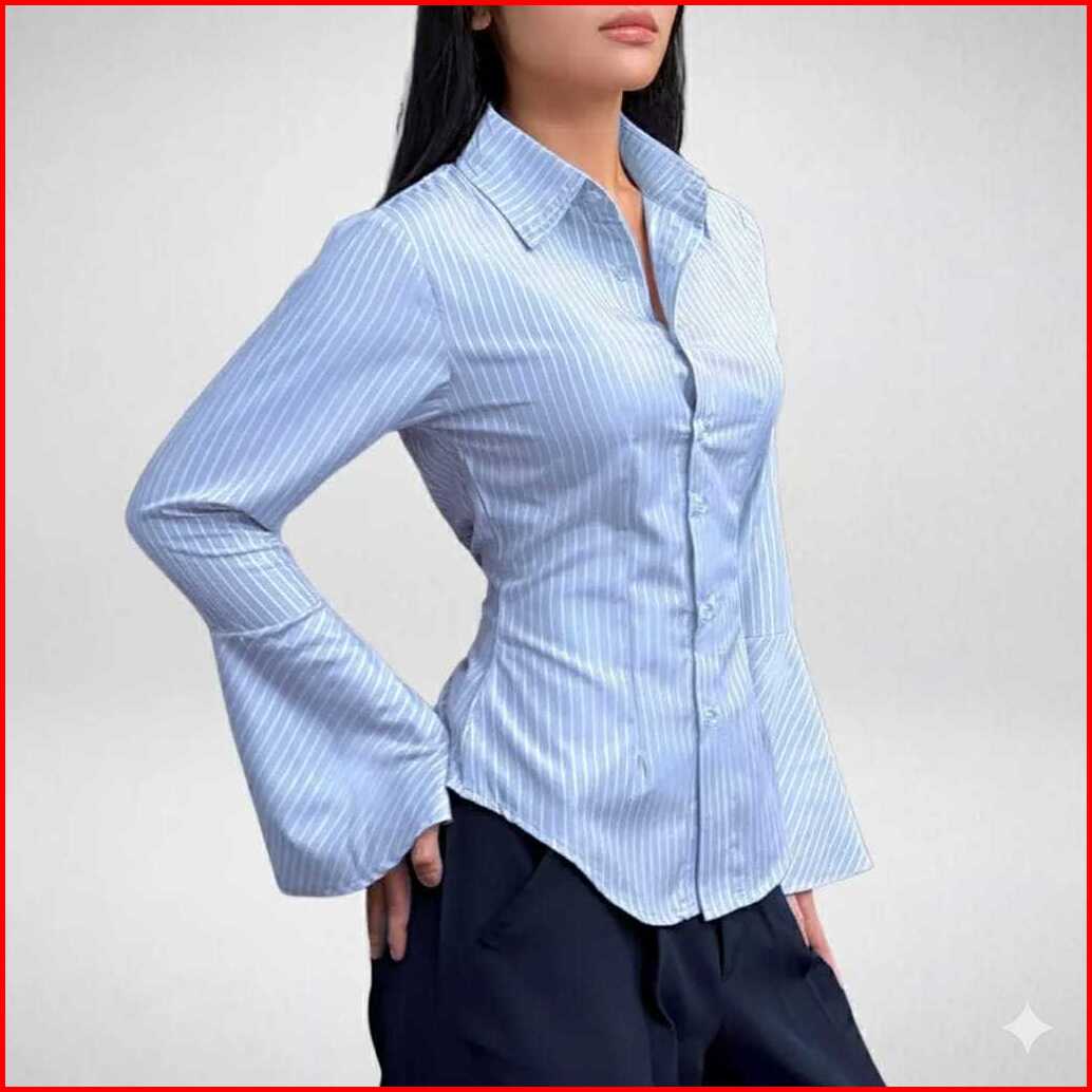 Kemeja Whispie Money Magnet Slim Fit Body - Kemeja Kerja Wanita Motif Salur Lengan Flare Casual