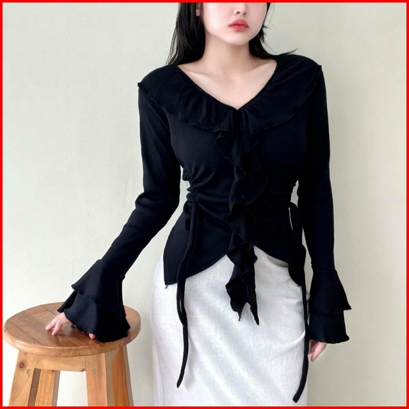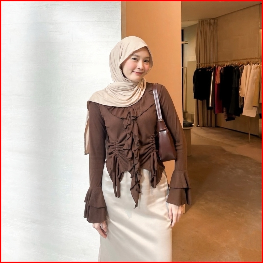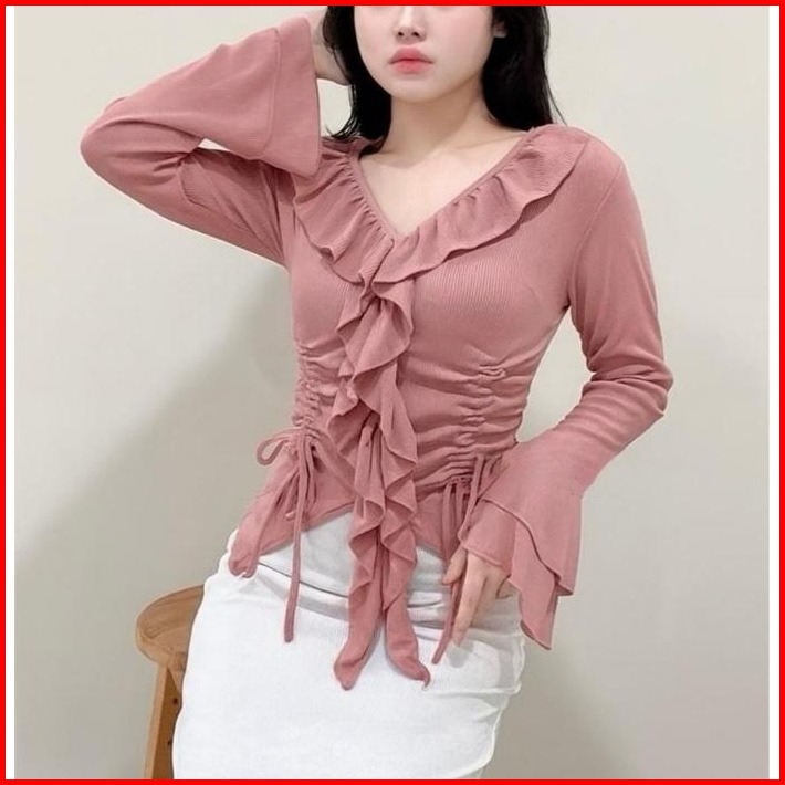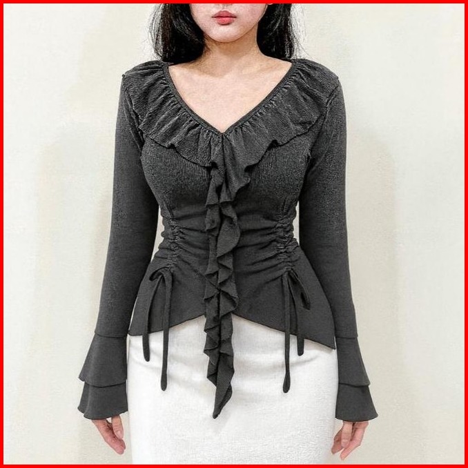 Blouse Eleanor Ruffle Neck Blouse Aesthetic Atasan Long Sleeve Wanita