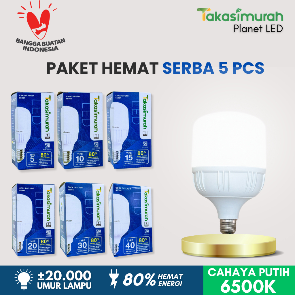 Paket Hemat 5 pcs Lampu LED Tabung Jumbo TBulb Bundling Tipe 50/40/30/20/15/10/5 Putih Terang 80 PERSEN Hemat Energi