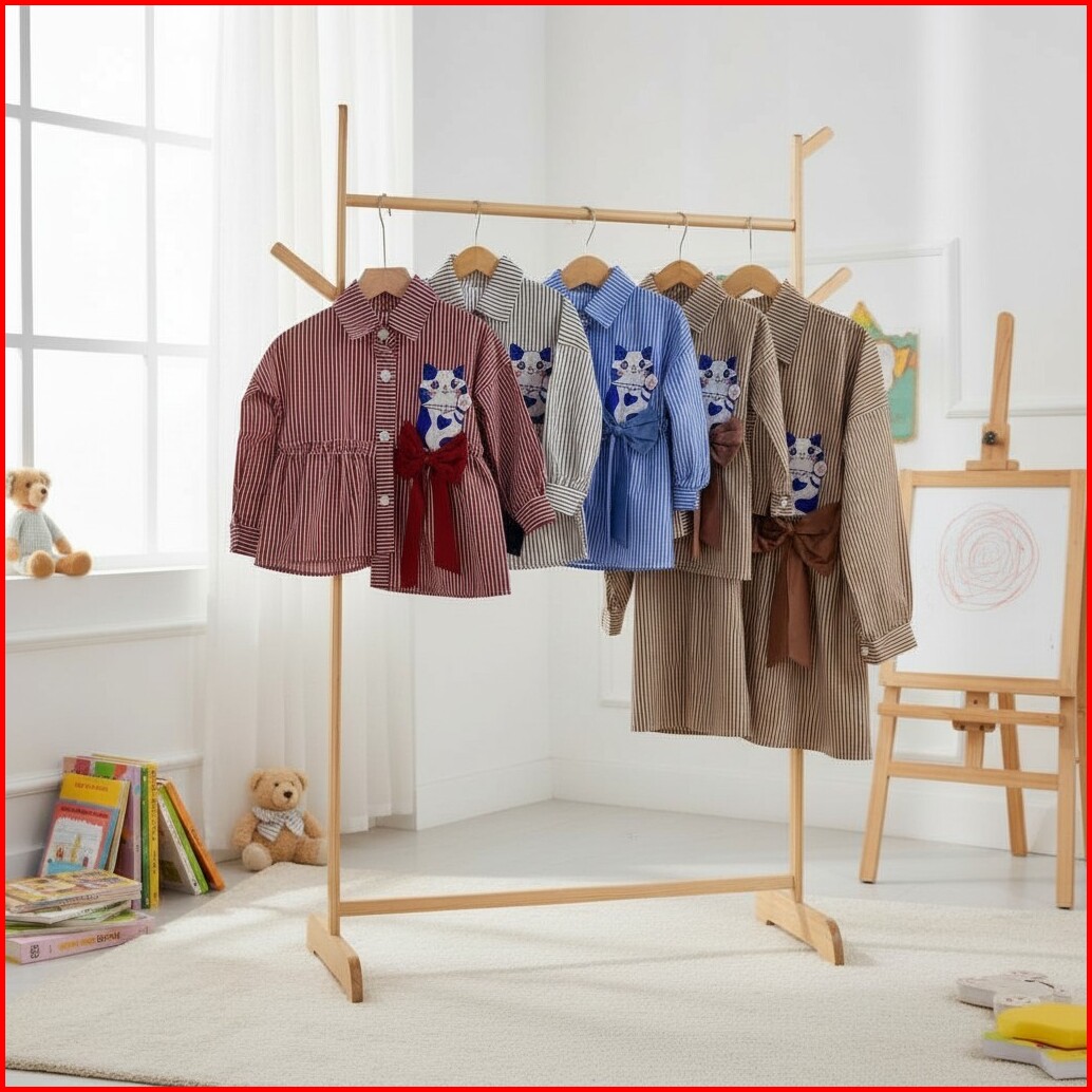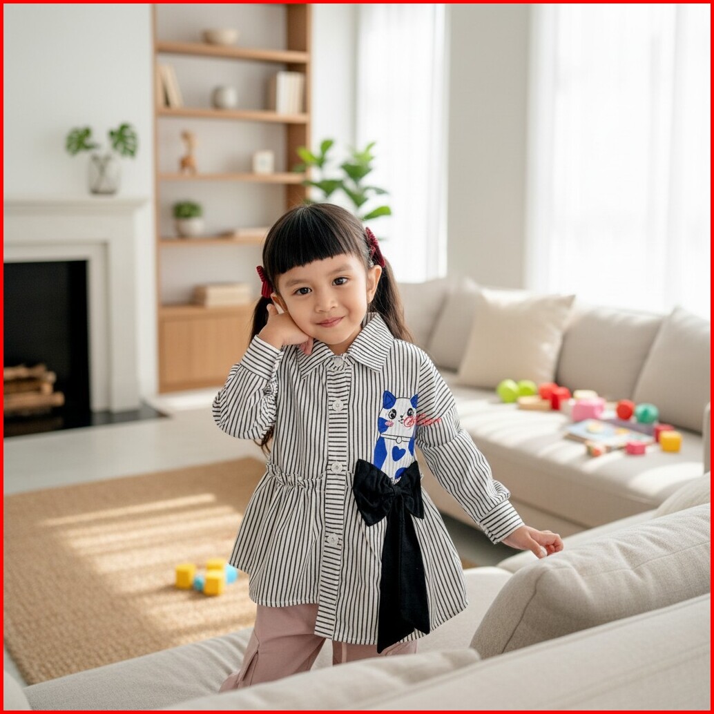 Kemeja Miaw Anak Perempuan Bahan Katun Salur Dengan Motif Kucing Lucu Dan Pita Fashion