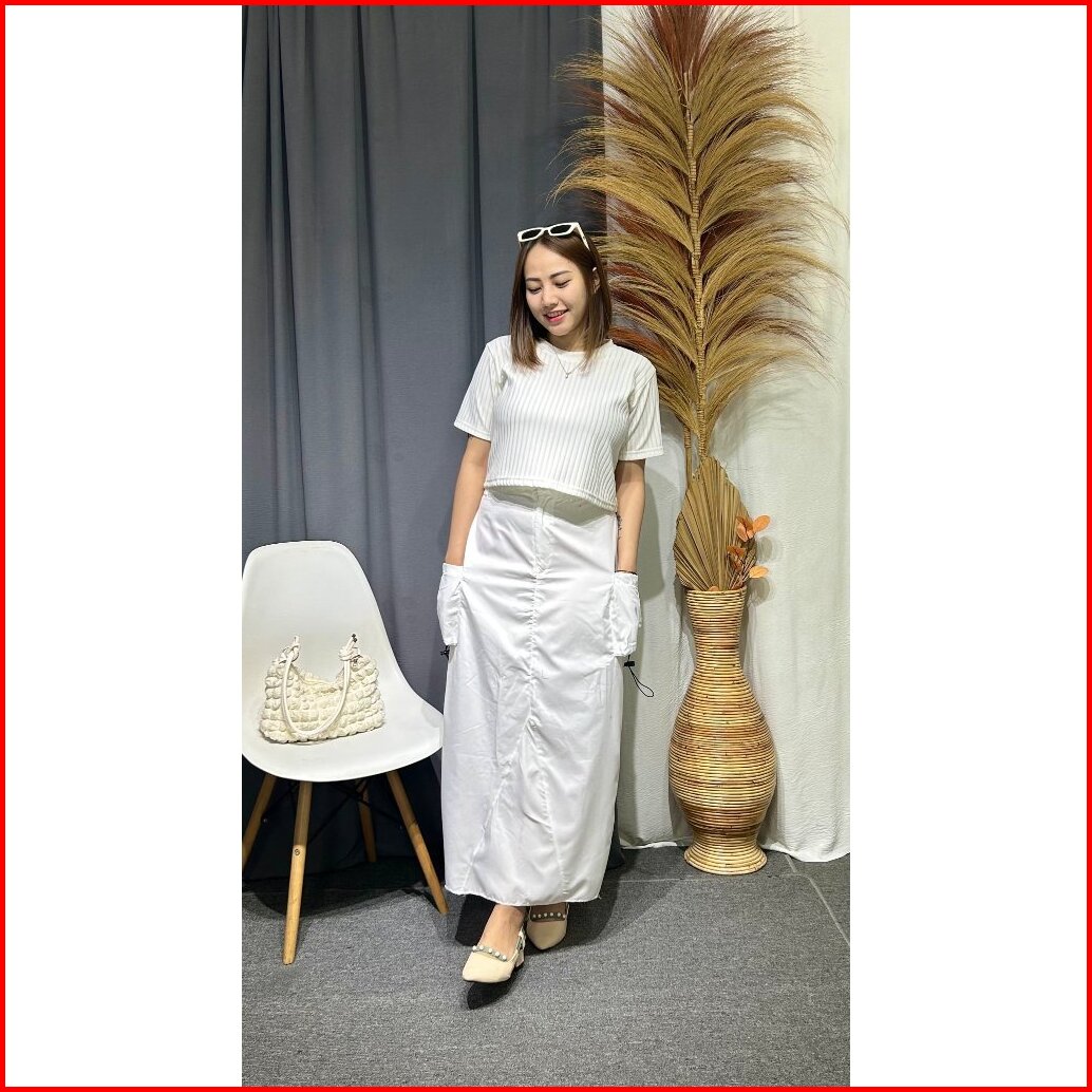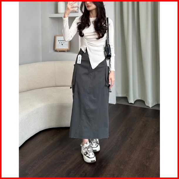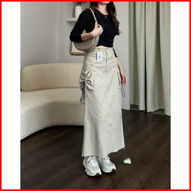 Rf - Milan Skirt Rok Cargo Serut Wanita Pocket Long Skirt Maxi Panjang