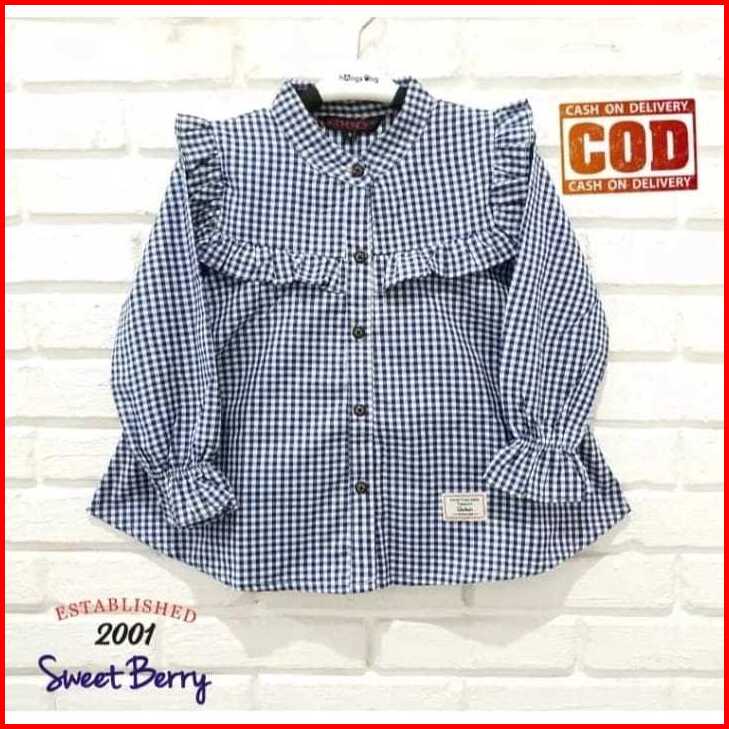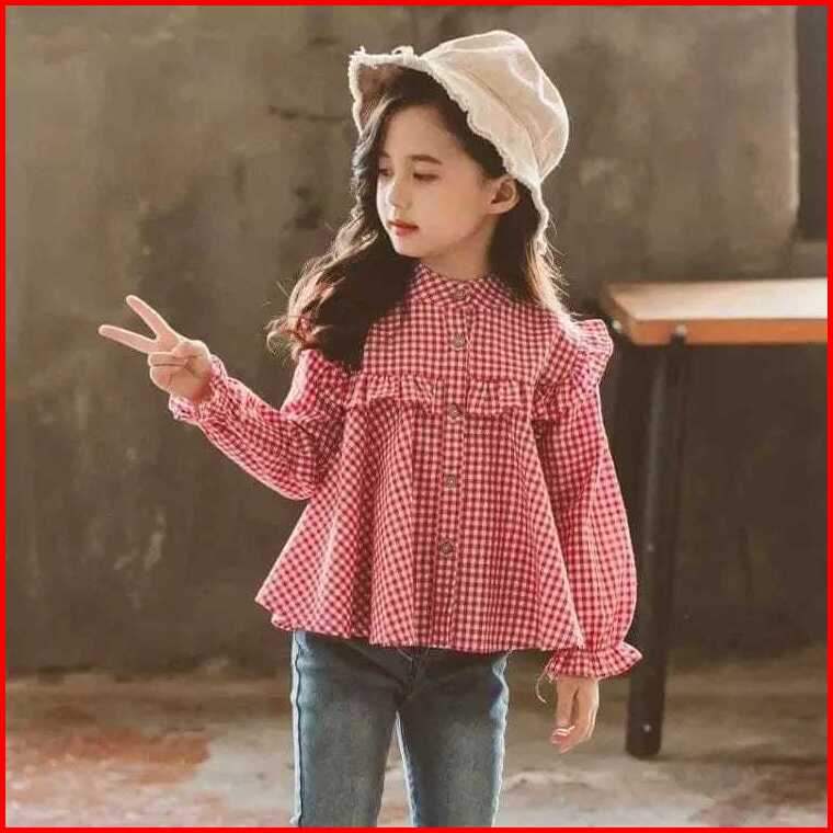 Kemeja Anak Perempuan Motif Kotak-kotak Korean Style Blus Anak Perempuan 3-12 Tahun Aksen Kancing