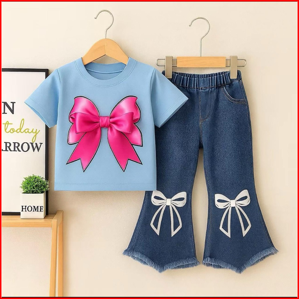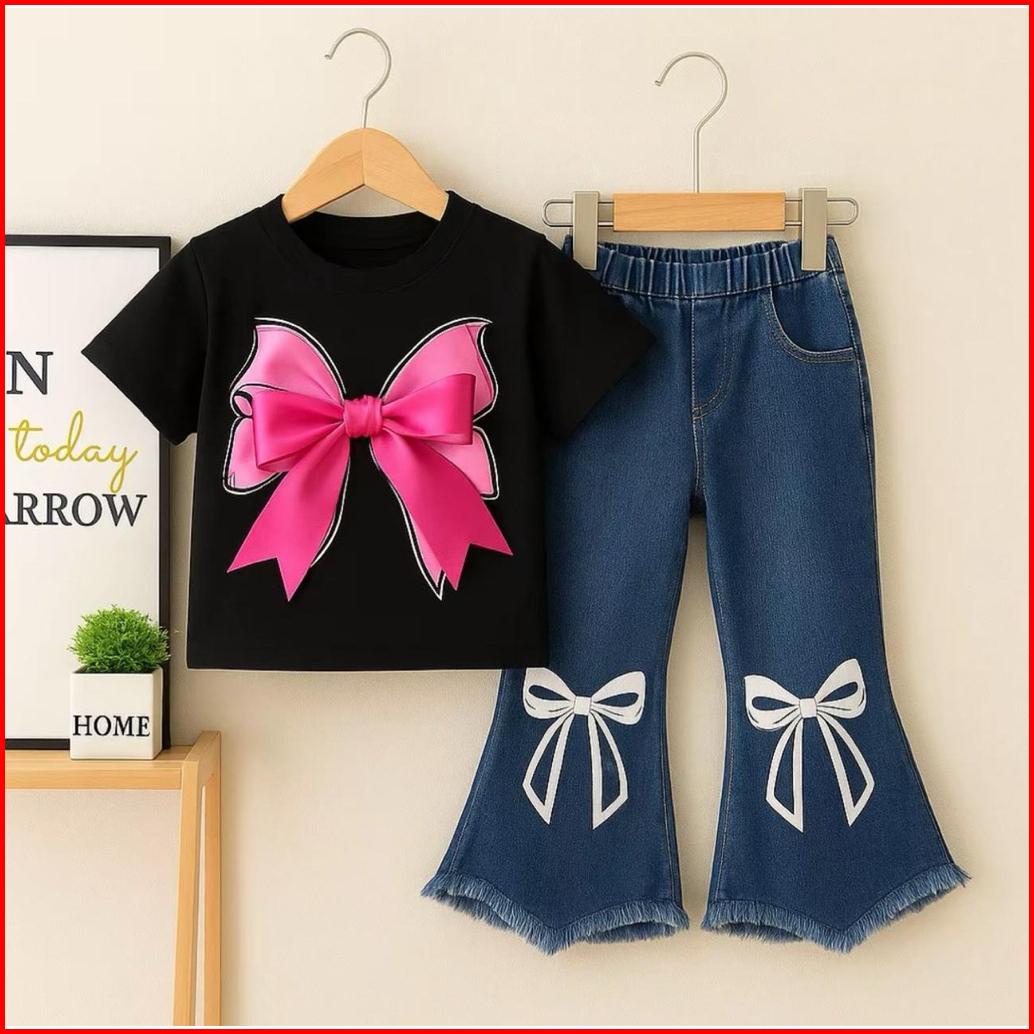 Setelan Anak Perempuan Pakaian Anak Perempuan Celana Denim Setelan Anak Motif Pita Motif Mewah Dan Trend Kekinian