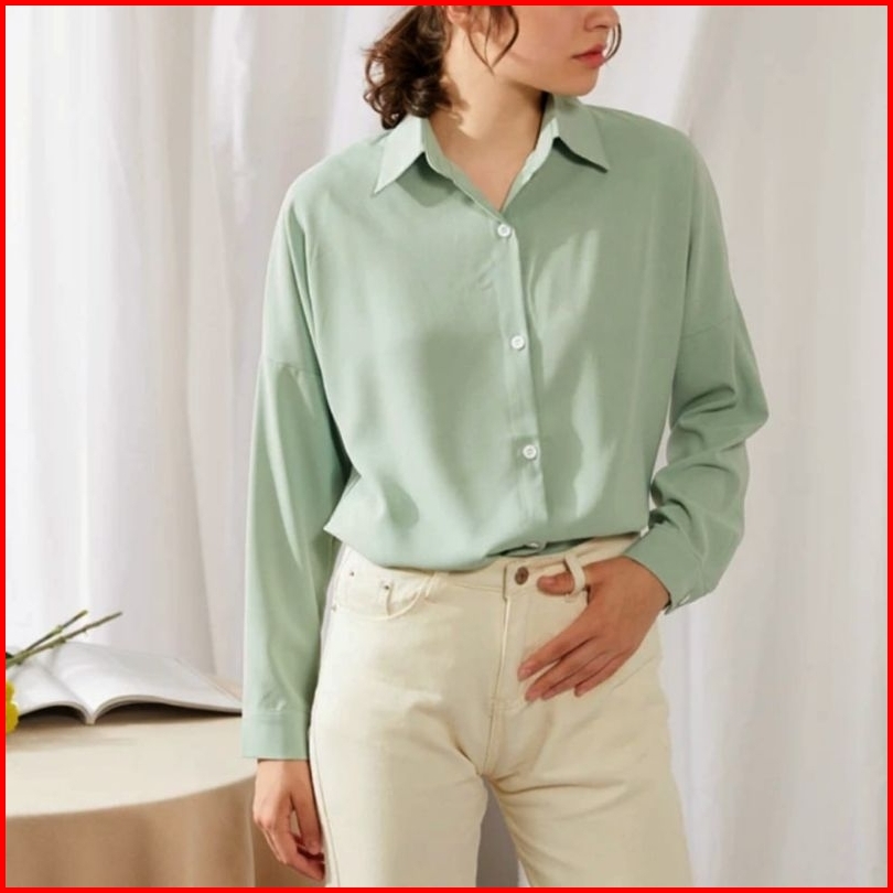 Kemeja Wanita Katun Basic Lengan Panjang Hitam Putih Navy Army Sage Atasan Wanita Kerja