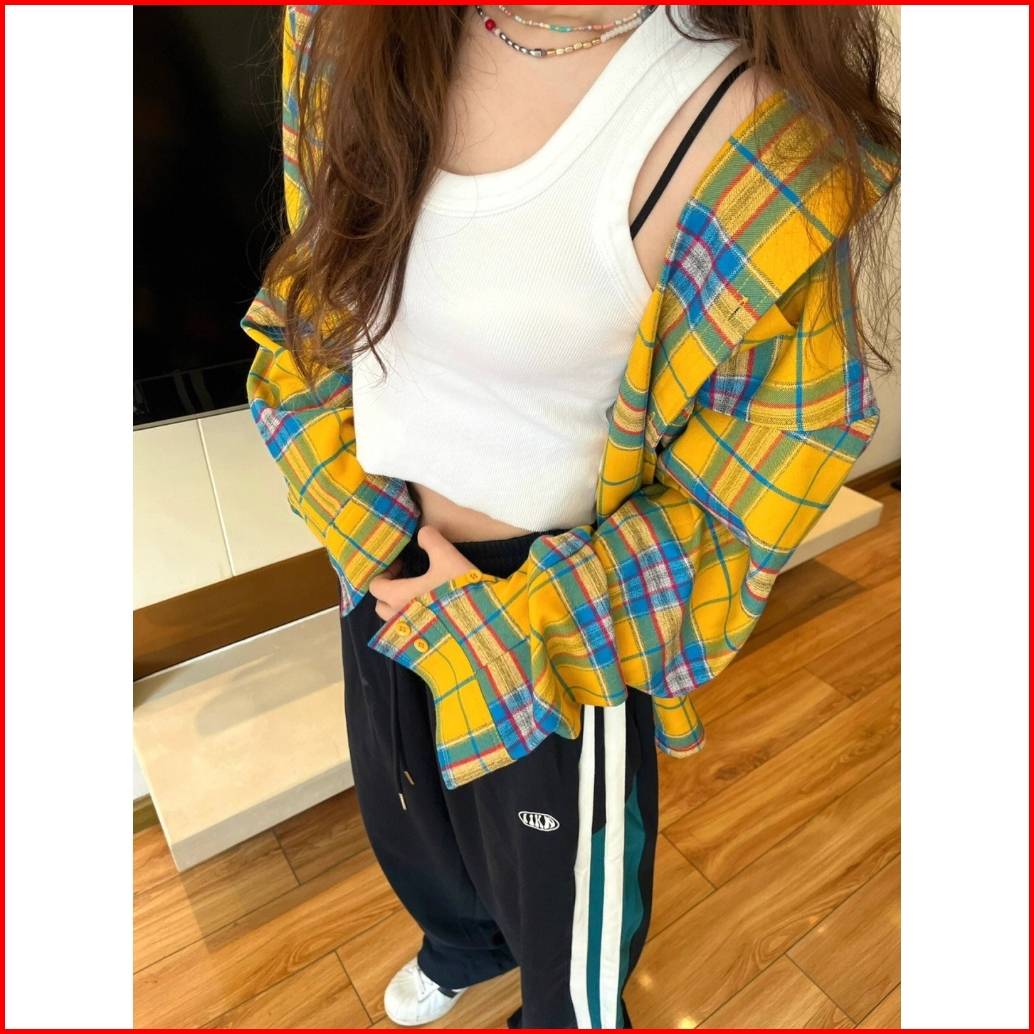2toyoung Kemeja Lengan Panjang Kotak-kotak Kuning Wanita Kemeja Longgar Kemeja Wanita Atasan Wanita Baju Atasan