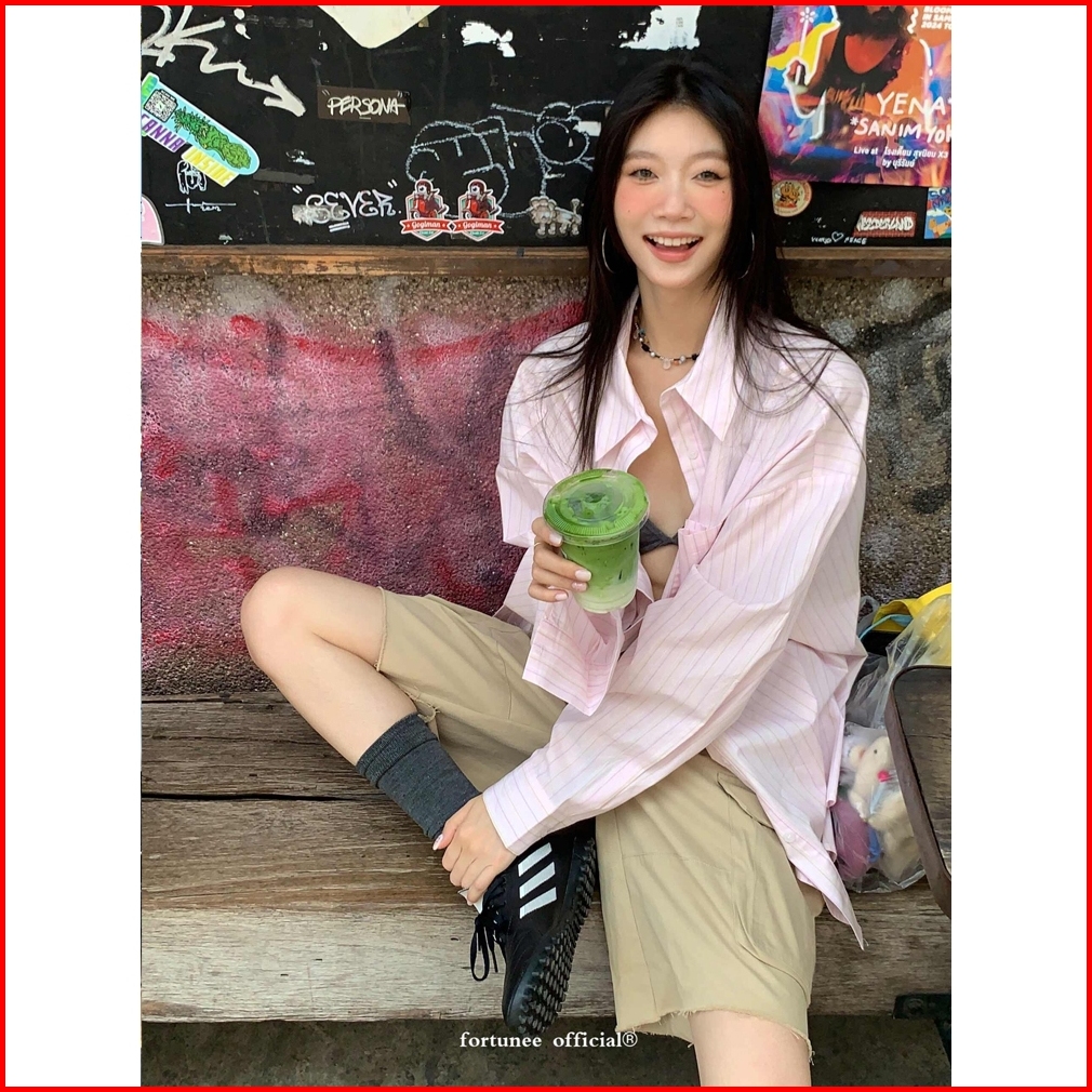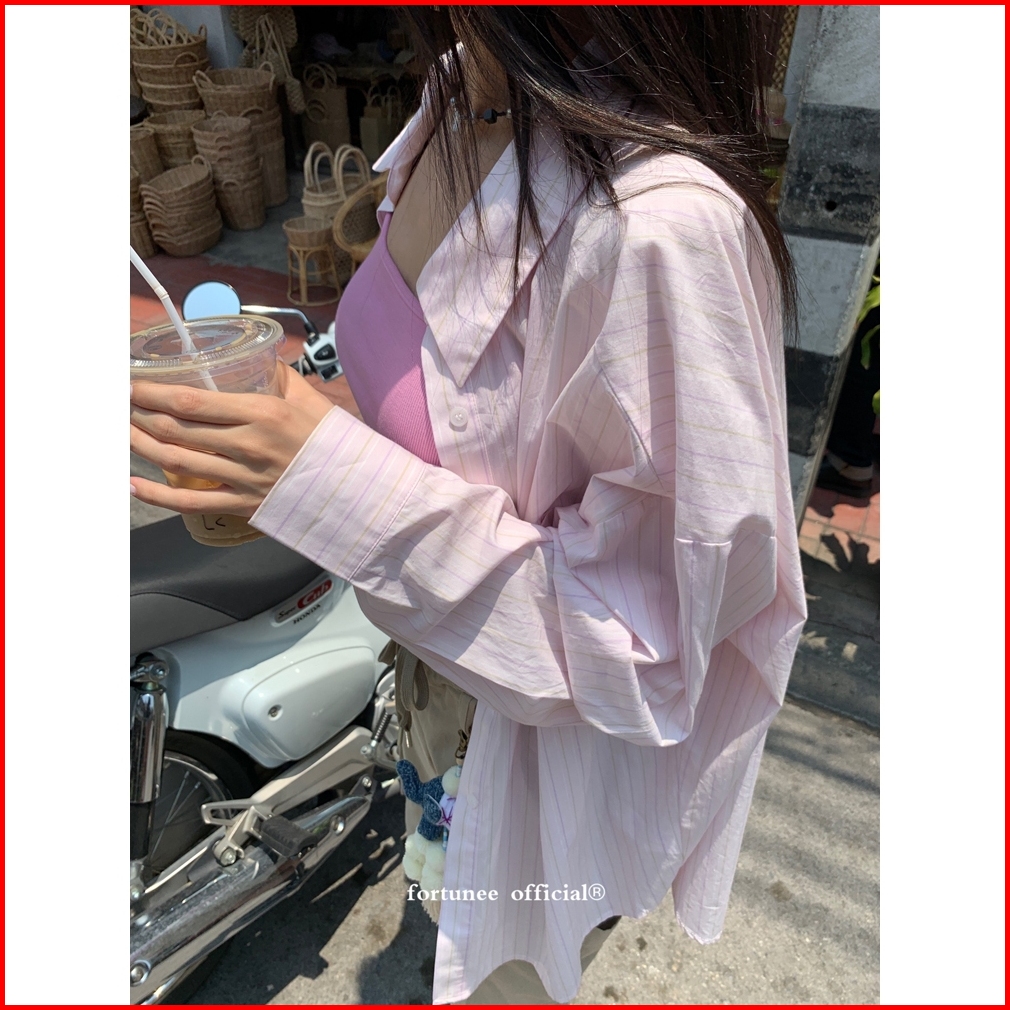 2toyoung Kemeja Fitted Fitted Shirt Kemeja Kerja Wanita Kemeja Lengan Panjang Kemeja Katun Wanita Merah Muda Stripe Baju