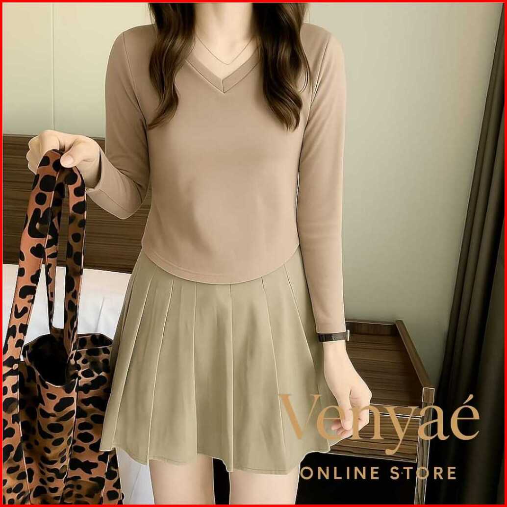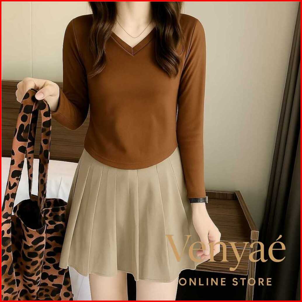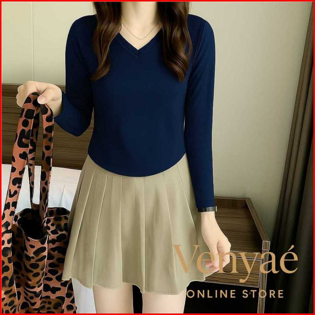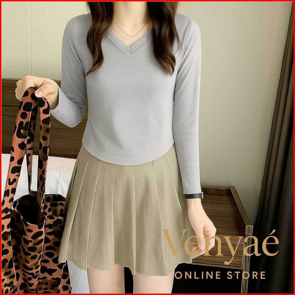 Venyae Kaos Crop V-neck Lengan Panjang Wanita Polos Bahan Spandek Melar Elastis Slim Fit Model Korean Oval