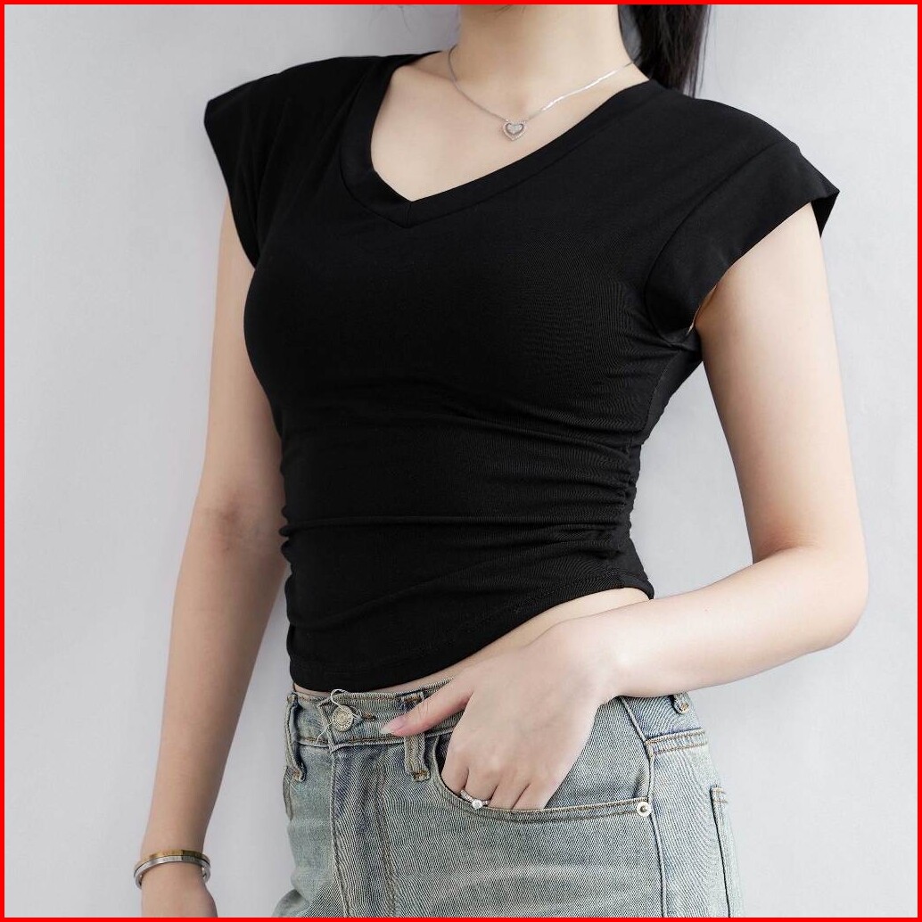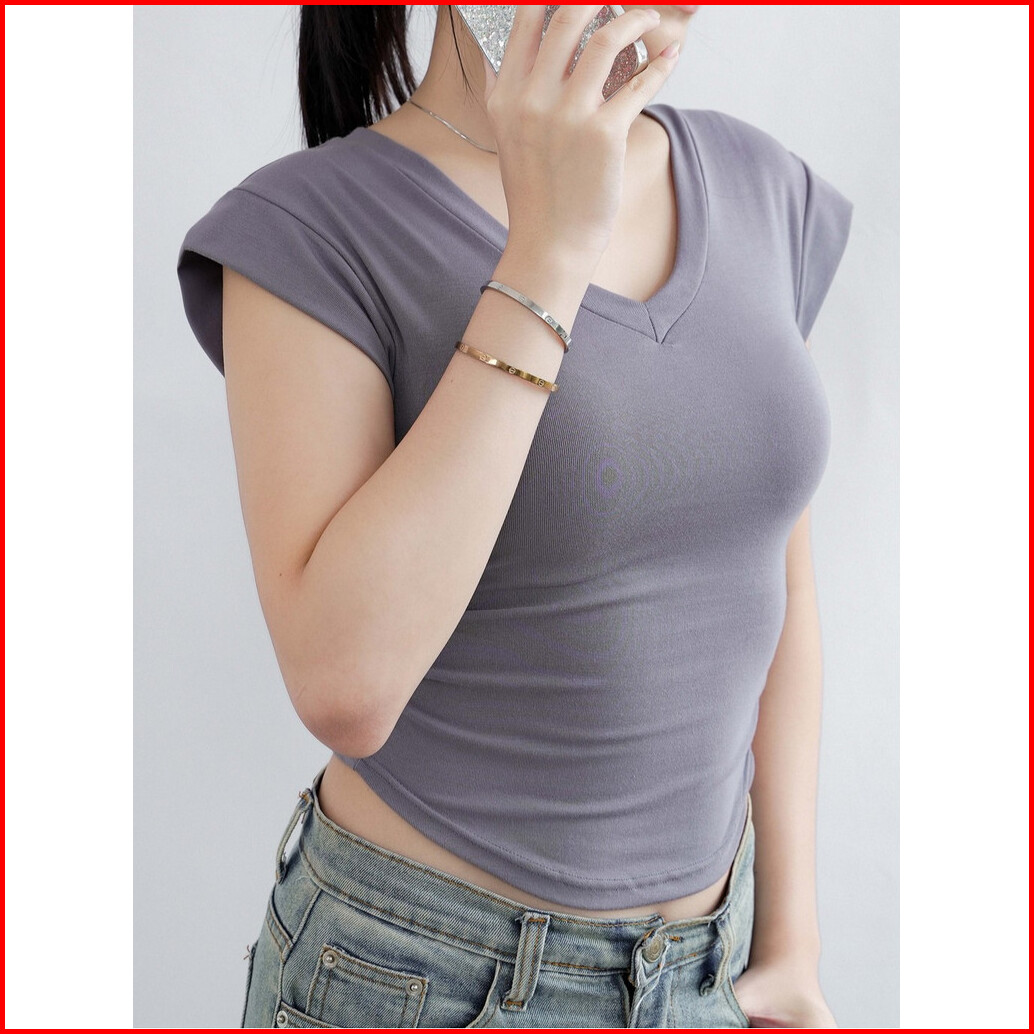 Baju Kaos Atasan Basic Cropped V Neck Lengan Topi Wanita Rayon Premium